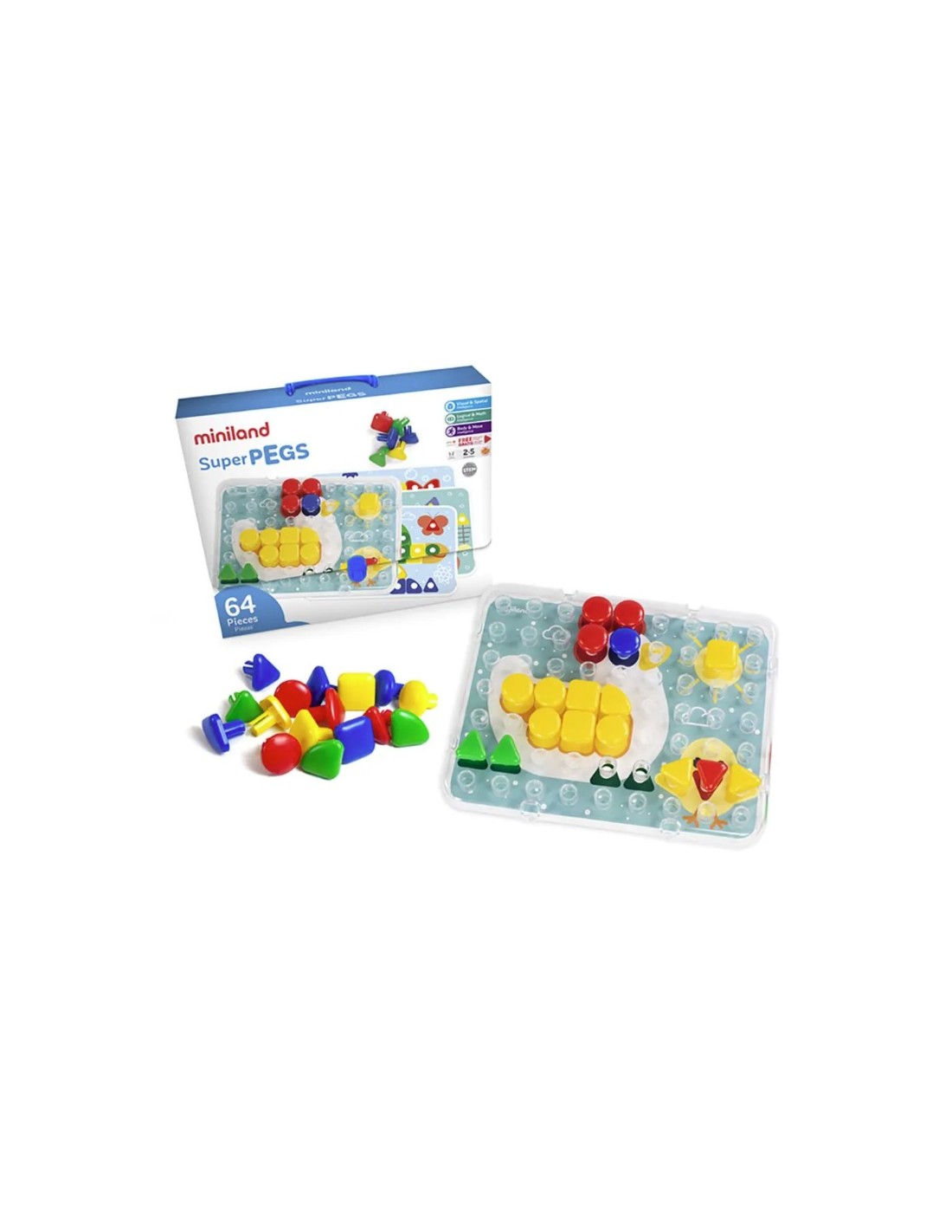 En aquest complet maletí trobaràs un munt de pius de grans mesures fets de plàstic. Tenen diferents formes i colors que et permetran fer dibuixos a partir dels forats de les plaques. A més, al disposar de models, només hauràs de reconèixer la forma i el color per col·locar el piu correcte i crear el dibuix. Al jugar amb aquest joc, el nen desenvoluparà la seva coordinació ull-mà, la diferenciació de formes i colors, la organització espaial, la imaginació i la expressió verbal. Conté: 64 pius gegants de 4 formes i 4 colors, i 4 models de cartró.