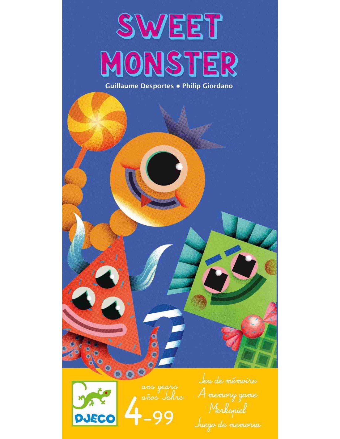 L'objectiu de Sweet Monster de Djeco és atreure als petits monstres trobant les seves llaminadures preferides, que recordaràs gràcies a la teva memòria. Aquest joc està format per 12 cartes diferents amb anvers i revers (1 anvers de monstre, 1 revers de llaminadura o un peix podrit), que es col·loquen en el centre de la taula pel costat del monstre.