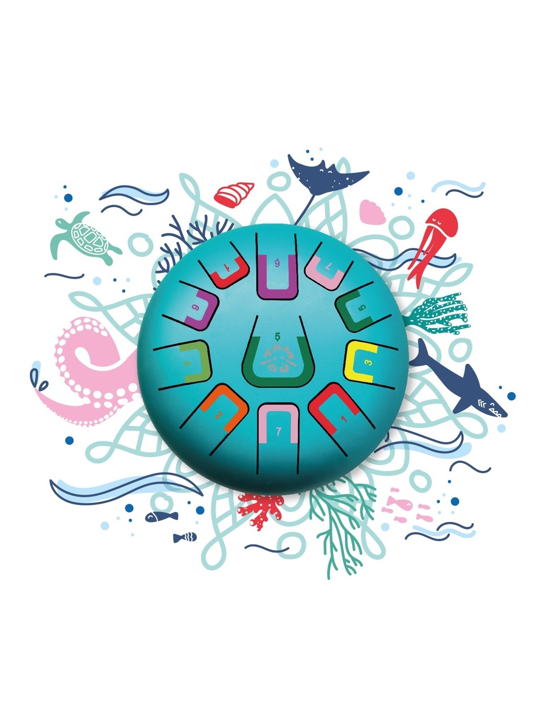 El Tambú Turquesa és un instrument musical de percussió melòdica que convida a submergir-se en el món dels sons de manera intuïtiva, creativa i accessible. Dissenyat per a nenes, nens i adults, a partir de 3 anys, aquest tambor de llengüetes combina un disseny atractiu i alegre amb una riquesa sonora ideal per a iniciar-se en la pràctica musical.