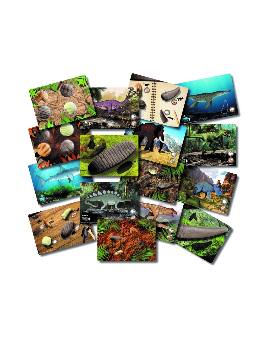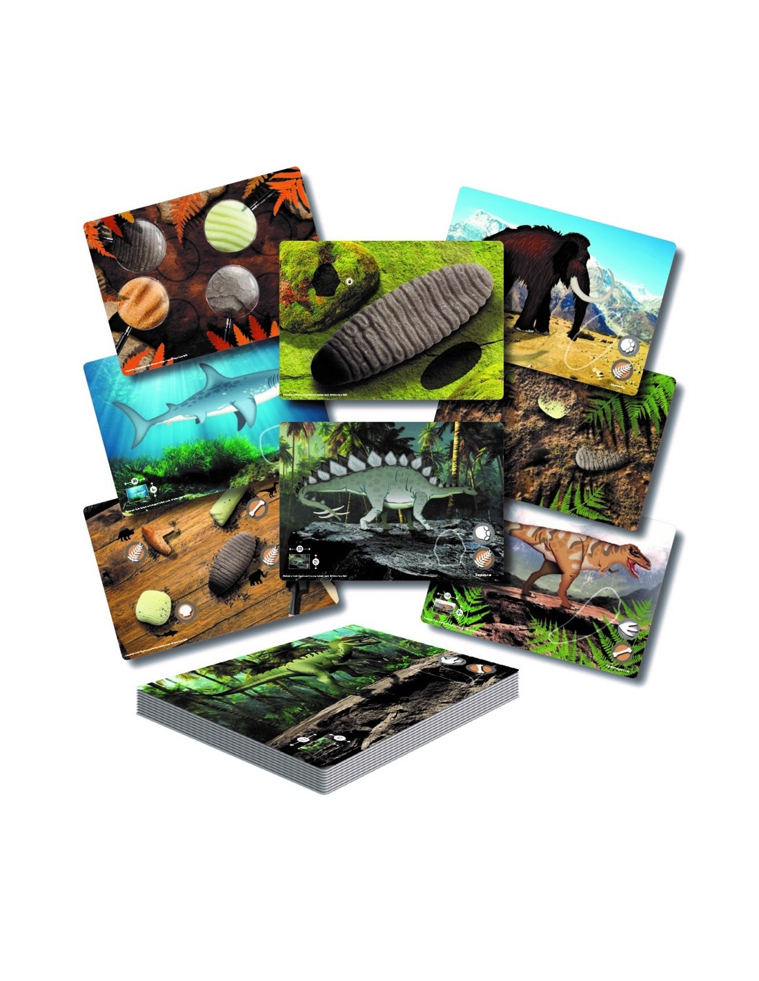 Cada targeta presenta dents de diferents animals prehistòrics, incloent-hi el Al·losaure, l'Iguanodont, el Mamut, el Pliosaure, el Ptychodus, l'Estegosaure, el Triceratop i el Tyrannosaurus rex. Els nens i nenes podran descobrir dents a grandària real, dents augmentades i dents mig enterrades, la qual cosa els permetrà comparar-los, aprendre sobre la seva grandària i entendre millor les característiques de cada espècie.