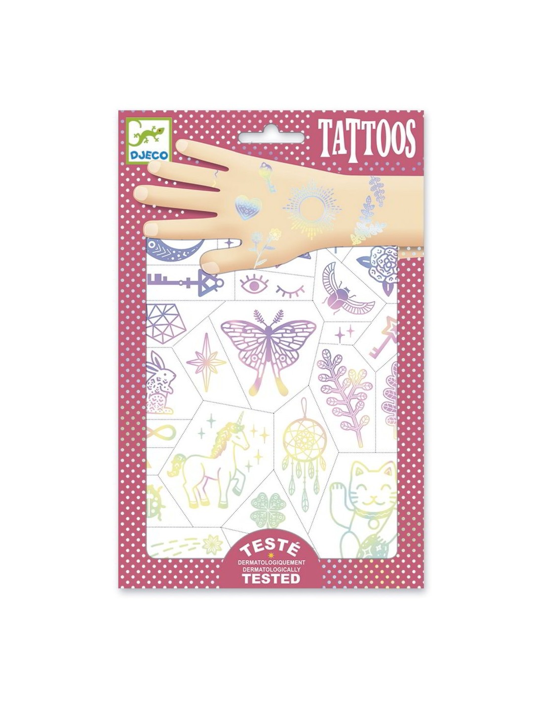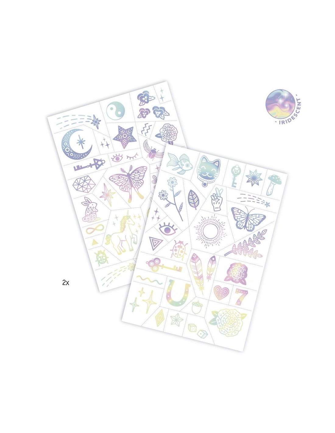 S'apropa la caloreta! I per això, et portem aquest conjunt de tatuatges temporals de Djeco, en aquest cas amb la temàtica “Amulets de la sort”. Aquest té dues làmines de dissenys amb tatuatges metal·litzats amb colors i personatges de fantasia, com unicorns i altres objectes de la mateixa temàtica, com els trèvols de quatre fulles. Impressiona a tots amb aquestes il·lustracions fixades a la teva pell!