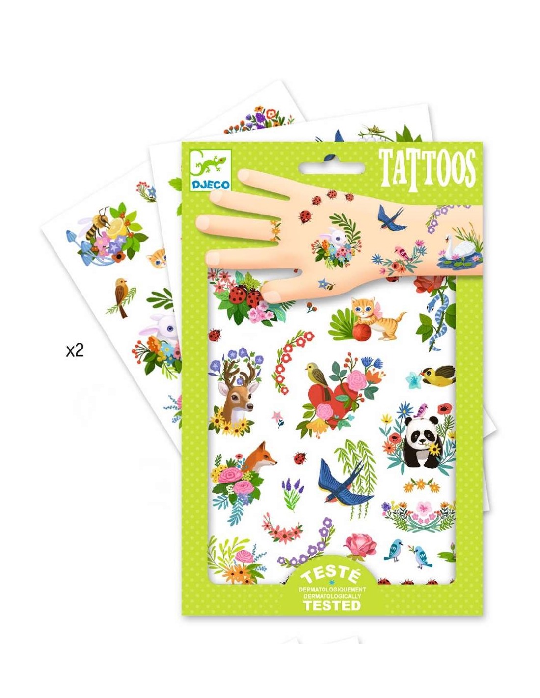 Com tots els productes d'aquest tipus de Djeco, els tatuatges compleixen totes les normatives de la Unió Europea i han estat testats dermatològicament. El pack inclou múltiples dissenys relacionats amb la primavera com flors i animalons.