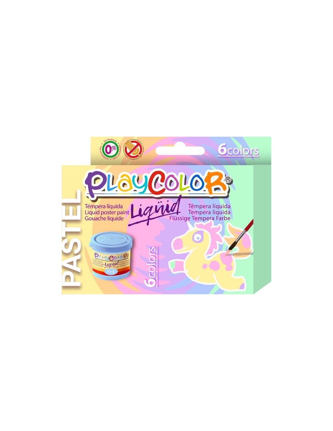 Us presentem aquest pack Playcolor Liqüid Pastel, amb 6 temperes líquides de colors pastel i que inclou un pinzell perquè us poseu a crear obres d'art sense límits des del primer moment. Quadres de colors, fusta que pren vida amb preciosos tons pastel, testos que es donen una rentada de cara… les possibilitats són infinites! Ideals per a donar un toc fresc i primaveral a les vostres creacions i adorar els racons de la casa, tant a les habitacions dels nens i nenes com en qualsevol altra. Cada pot inclou 40 mil·lilitres de pintura de color pastel (en els colores verd, morat, groc, blau, rosa i taronja) sense parabens.