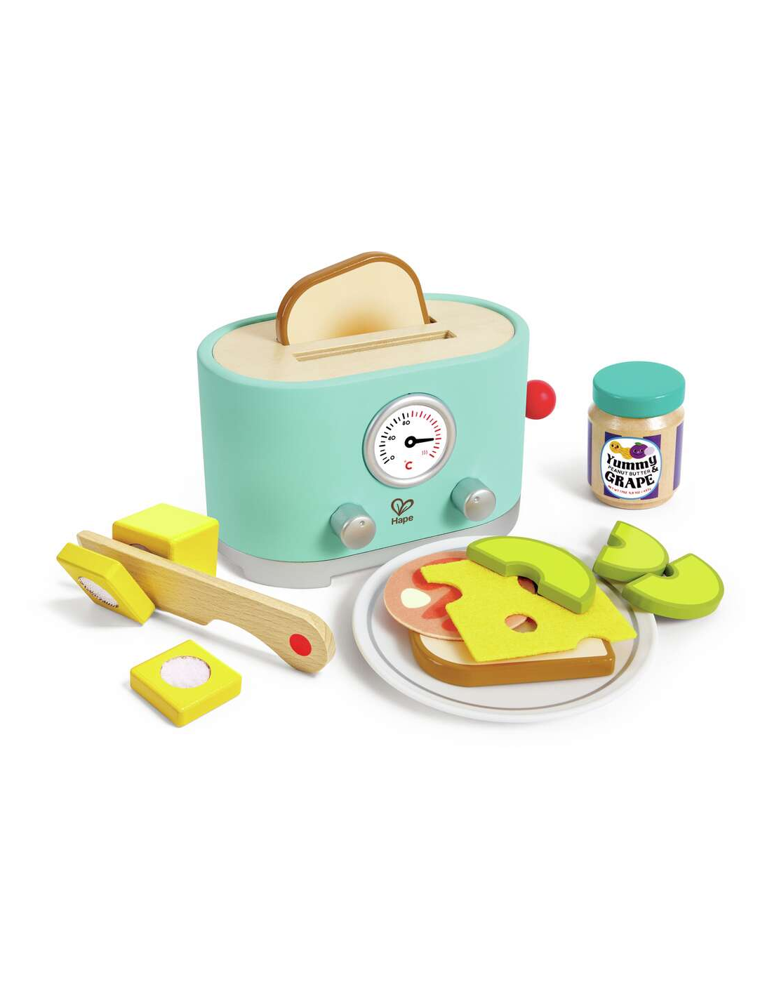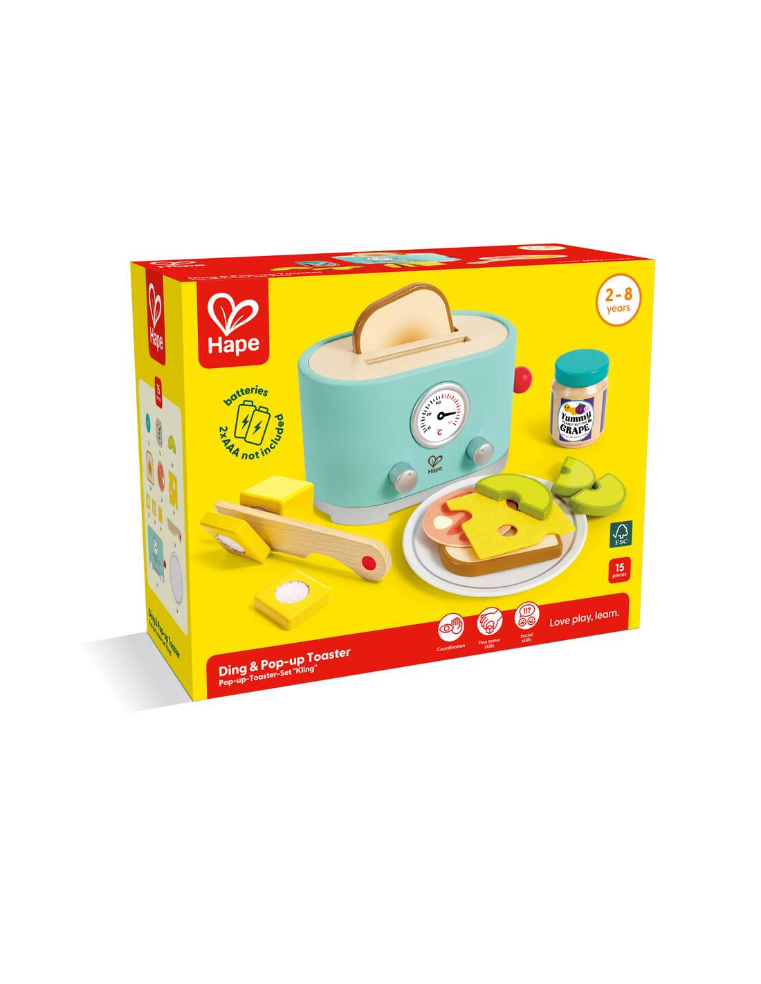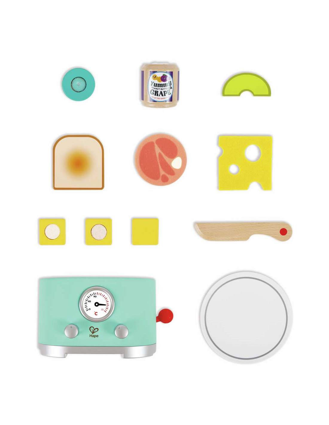 Presentem la Torradora Ding & Pop-up de Hape, una joguina encantadora i funcional que permet als petits recrear un desdejuni perfecte. Aquest set inclou una torradora de disseny modern, dues peces de torrades, rodanxes d'alvocat, pernil, formatge, melmelada, mantega "tallable," un ganivet i un plat. Els nens poden manipular la palanca, veure com les torrades fan un so de tic-tac mentre es "torren" i gaudir de la sorpresa en escoltar el "ding" que assenyala que estan llestes per a servir. És ideal per a hores de joc ple de creativitat!