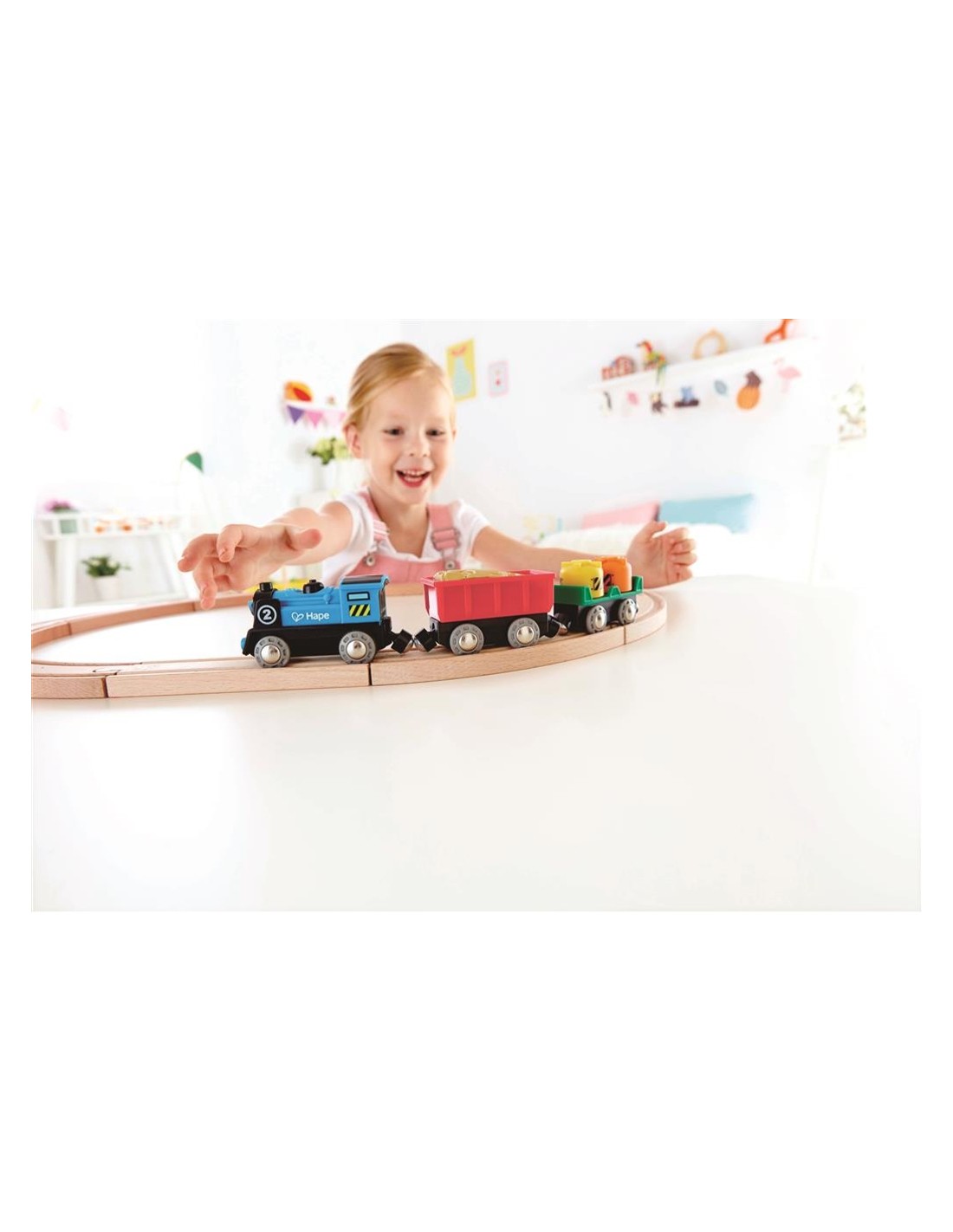 Hape ens presenta aquest divertit tren de mercaderies a piles de joguina, un clàssic actualitzat a les joguines d'avui dia per a brindar la millor diversió als teus nens.