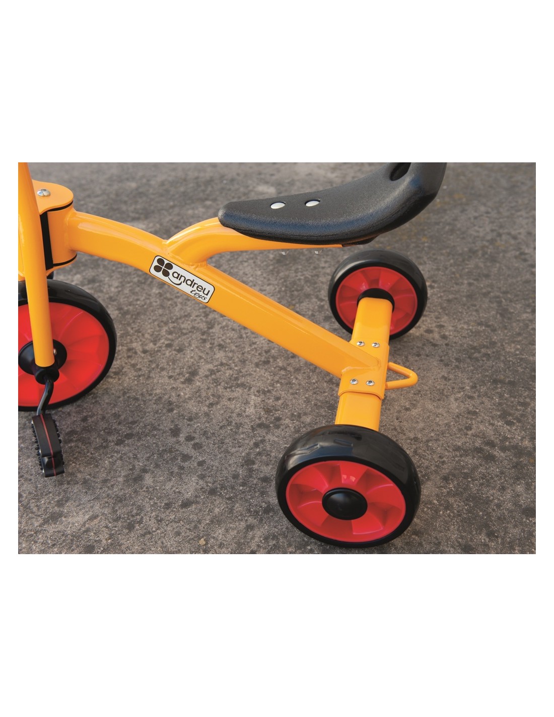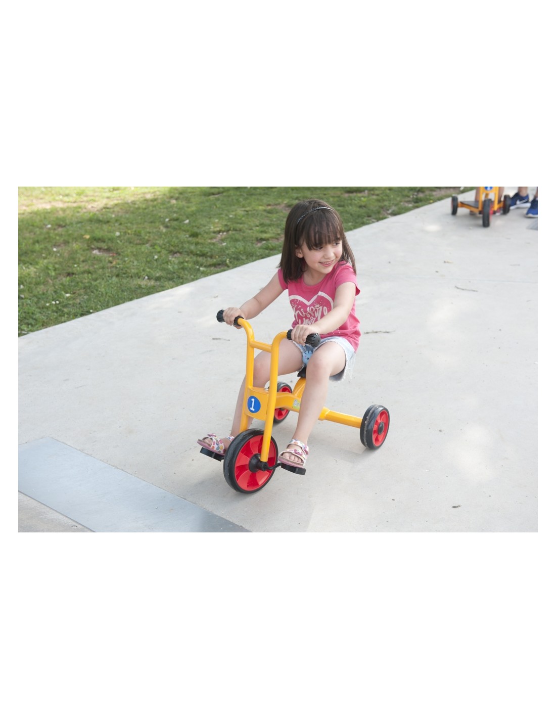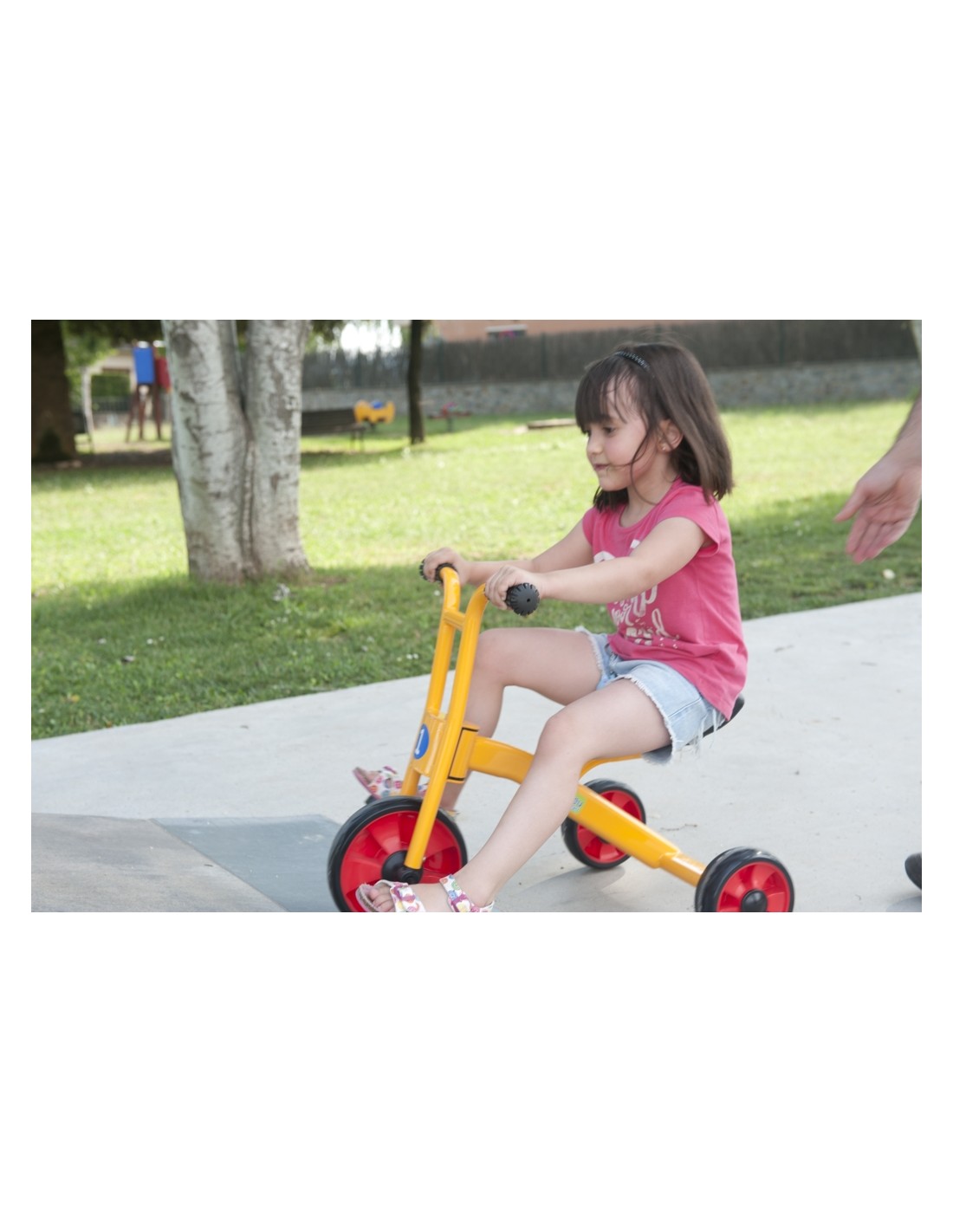 Tricicle segur i resistent especialment dissenyat per a centres escolars i guarderies. Compleix amb les normes EN71 de la CE. És de fàcil muntatge. Oferim servei de recanvis. 3 anys de garantia del quadre i la forquilla. La pintura del quadre, forquilla i manillar és molt resistent contra la corrosió i els cops. El seient és anatòmic, està fabricat en polietilè i és resistent a la intempèrie. El disseny del tricicle és arrodonit per a una millor seguretat i té un tub d'acer preparat per un ús intensiu. Referent als pedals, són antilliscants i el seu eix i el seu suport estan fets d'una sola peça d'acer. Finalment, les rodes no tenen radis, així que són molt resistents a l'abrasió.