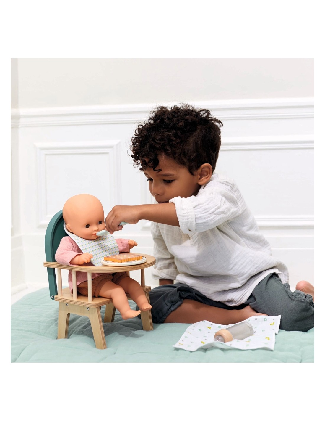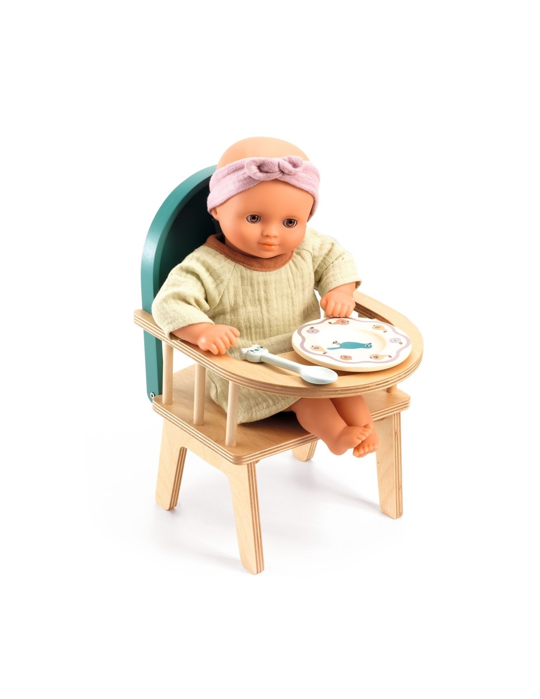 És l'hora del menjar dels bebès... aquesta adorable trona de la línia Poméa by Djeco serà un accessori molt útil i indispensable per a poder alimentar a les teves nines. Realitzada íntegrament en fusta, amb colors naturals i suport verd amb l'estampat d'un simpàtic ocell central. La trona mesura 18 x 20 x 27,5 cm i s'adapta perfectament a les nines de 30/32 cm de la línia Poméa.