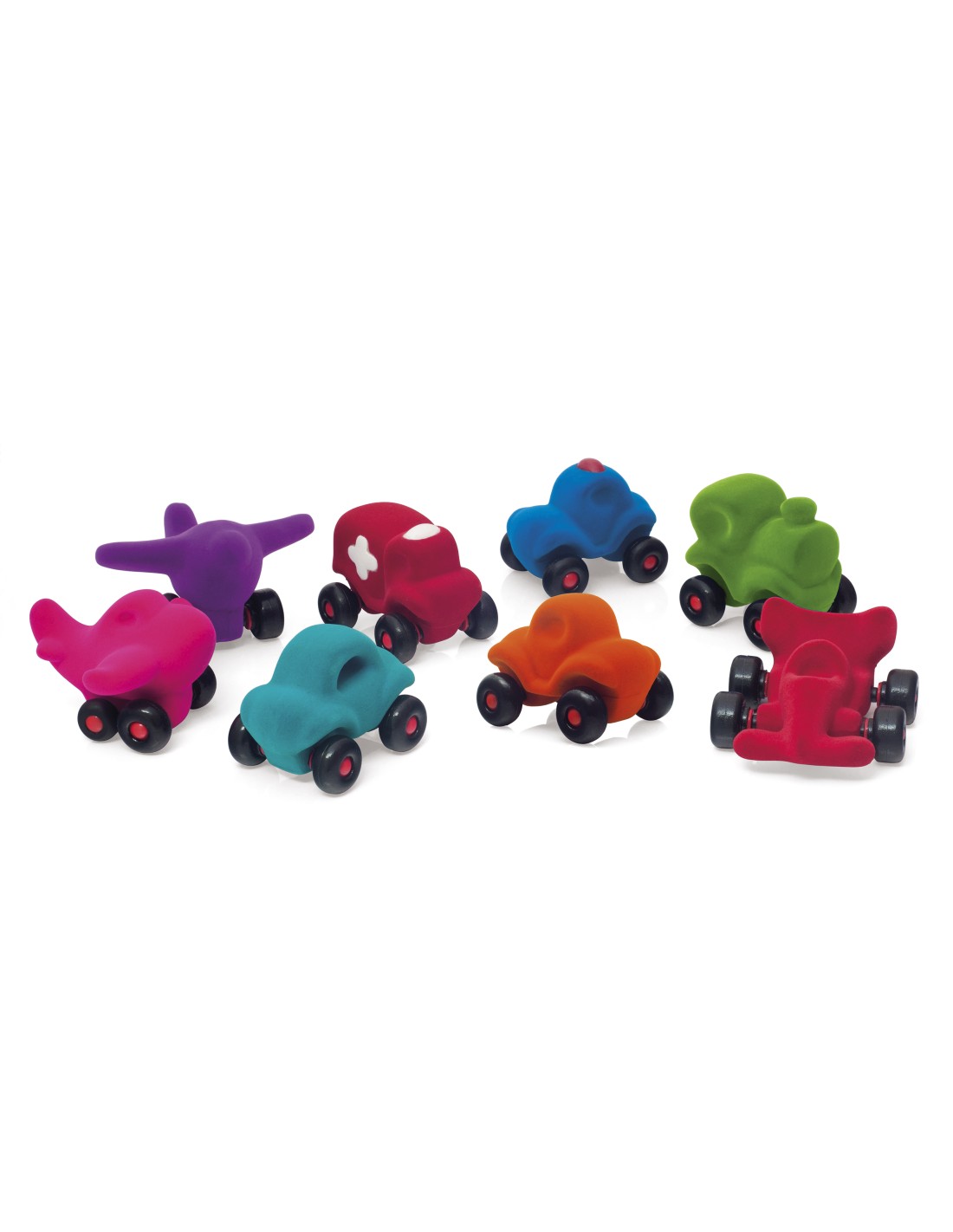 Aquests vehicles estan especialment dissenyats per a ser segurs i duradors. La suavitat del cautxú natural i el seu exterior vellutat ofereixen una experiència sensorial excepcional, que promou el desenvolupament de la motricitat fina i la coordinació ull-mà en els petits. A més, la varietat de colors i formes fomenta l'aprenentatge visual, ajudant els nens a identificar diferents objectes i colors mentre juguen.