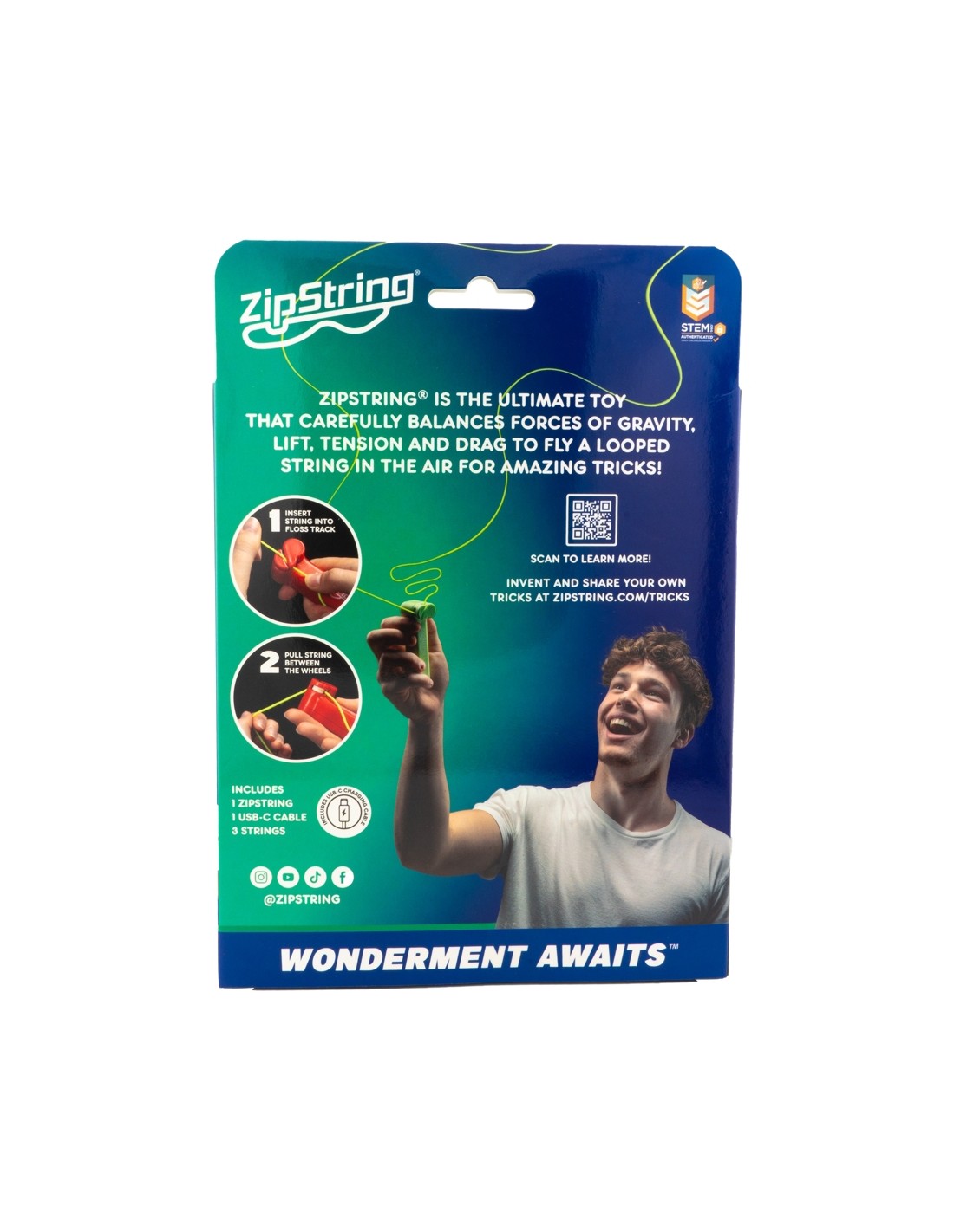El seu mecanisme intern equilibra la tensió, la gravetat i la resistència per a aconseguir un efecte gairebé màgic: l'entenimentada flota i gira com si tingués voluntat pròpia. Ja sigui a l'aire lliure, al parc o demostrant trucs en reunions amb amics, el ZipString garanteix moments plens de sorpresa i riallades.