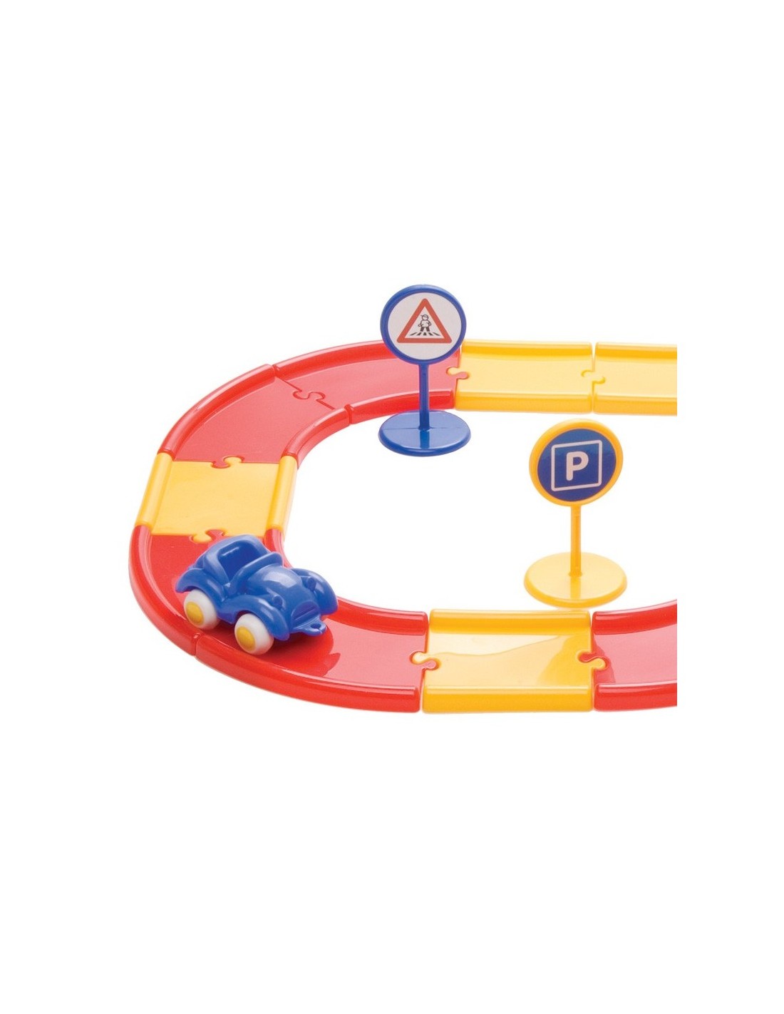 15 pistas + 3 vehículos + 3 señales. Complementos para los productos: garaje de plástico, mini garaje + 3 vehículos, comisaria + 1 coche + 1 personaje, bomberos + 1 camión + 2 personajes, hospital + 2 personajes + 1 camilla.