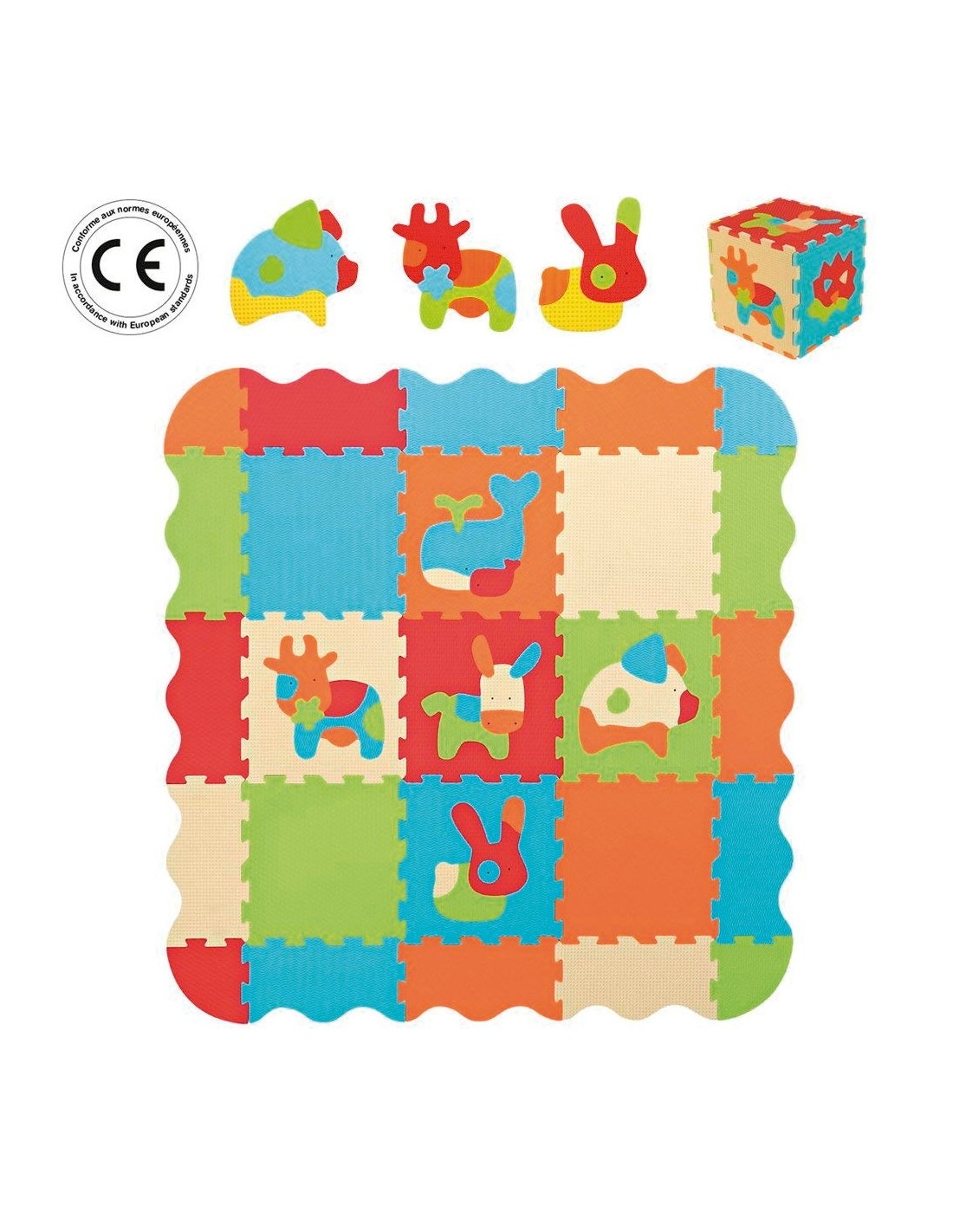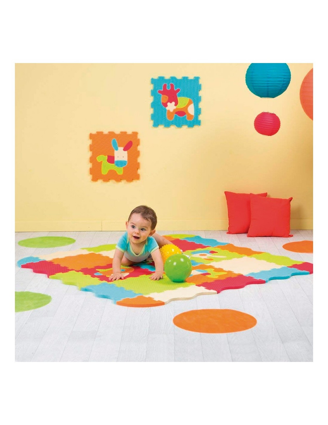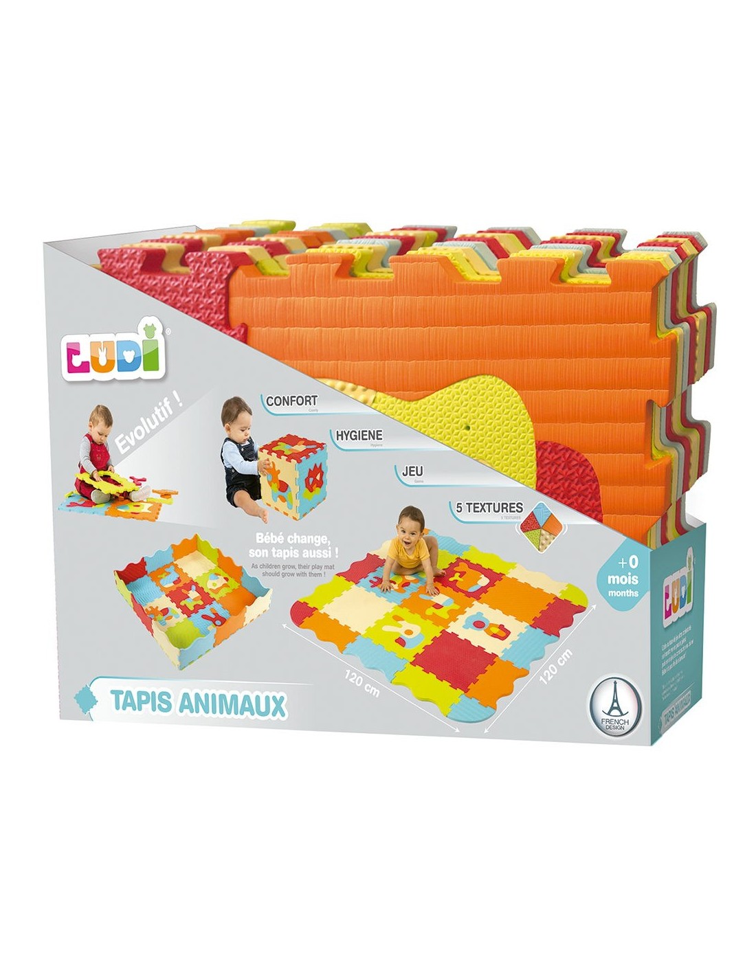 Confort, higiene y seguridad. La famosa alfombra de espuma de la marca Ludi no ha perdido ninguna de sus cualidades: protege al niño del suelo, amortigua los impactos y se lava fácilmente... ¡pero se le ha dado una nueva vida! Descubre nuevos colores brillantes, animales divertidos y exclusivos ... ¡y un nuevo rompecabezas! Para los bebés es una alfombra sobre la que jugar y, cuando crecen, se convierte en un potente juego de construcción 3D con el que desarrollar su creatividad e imaginación. Características: * Espuma extra gruesa * 5 texturas para el despertar del tacto. * Puzzle 2D para desarrollar destreza. * Construcción 3D gracias al potente sistema de crantinas.