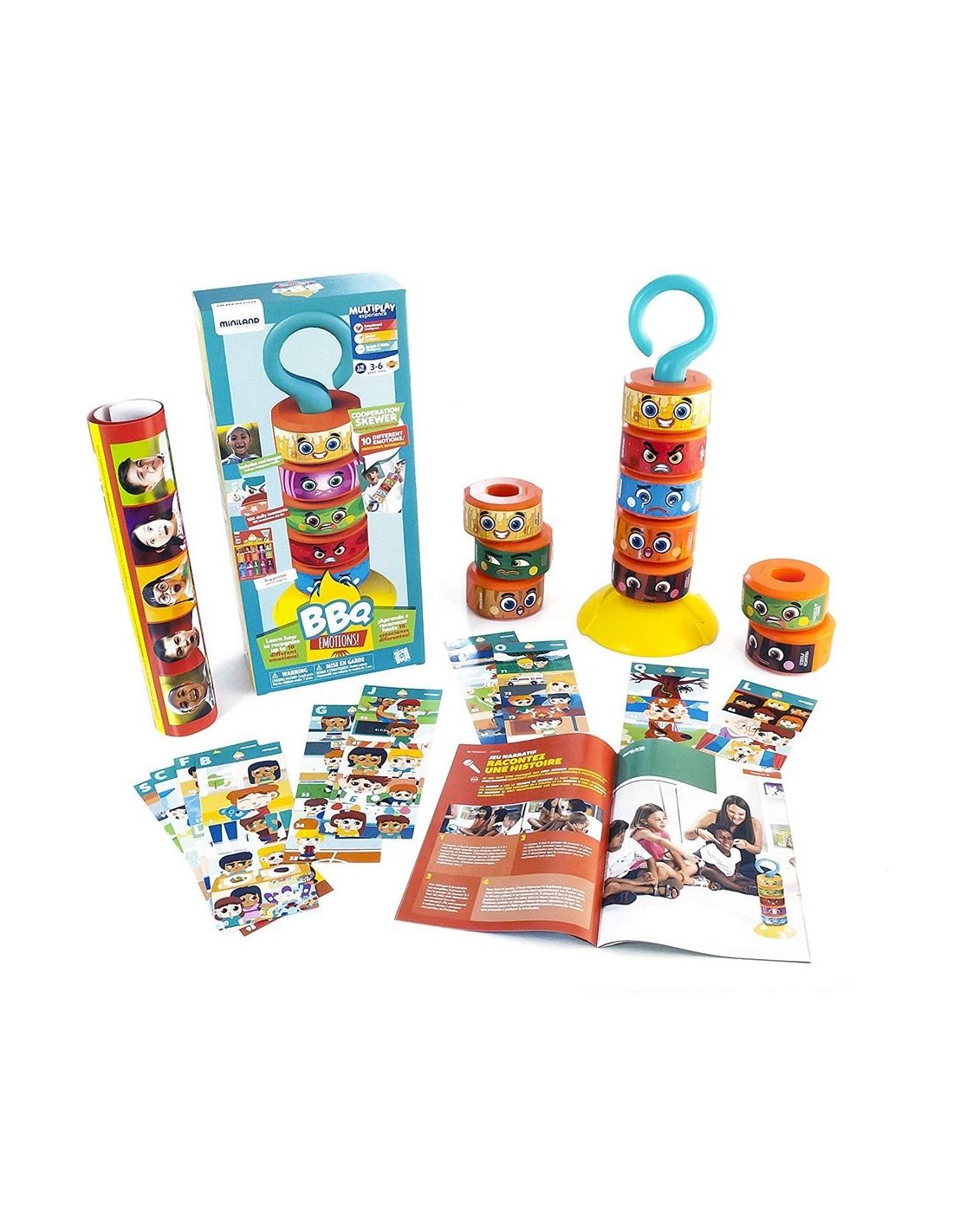 ¿A qué emoción corresponde esta cara? Pensado para niños y niñas entre 3 y 6 años, el juego BBQ Emotions de Miniland ha sido diseñado para desarrollar el reconocimiento y la gestión de las emociones en los niños y adultos. Jugando de manera individual o colectiva los participantes dialogan sobre ellas y aprenden a reconocer y comprender hasta 10 emociones diferentes. Valores pedagógicos • Comprender el mundo – observación • Desarrollo personal: autoconciencia • Comunicación e idioma: hablar y escuchar Contenido del juego BBQ Emotions: 1 brocheta, 1 base, 10 cuentas, 20 adhesivas, 10 tarjetas de juego, 1 póster y 1 guía didáctica.