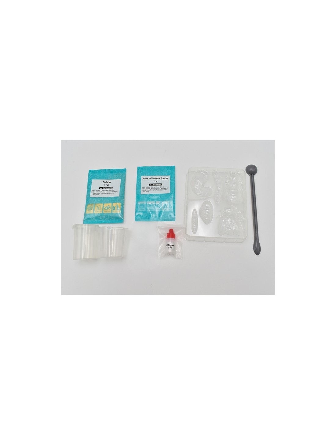 Este completo kit incluye todo lo necesario para iniciar el proceso creativo: un paquete de gelatina, polvo que brilla en la oscuridad, pigmento UV, moldes en forma de insectos y herramientas como una taza, un vaso medidor y una cuchara de doble extremo. Todo está diseñado para que los niños a partir de 8 años puedan experimentar con texturas, colores y efectos luminosos de manera segura y supervisada. También necesitarán ingredientes básicos del hogar como agua caliente, aceite vegetal, azúcar blanco y colorantes, lo que permite integrar la actividad en un contexto cotidiano.