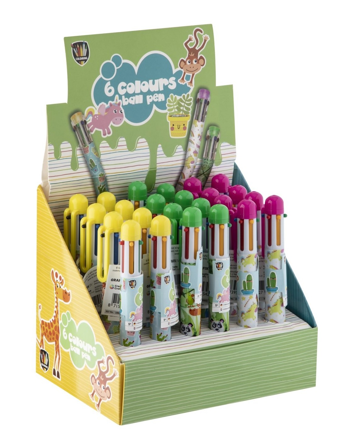 ¿Listos para volver a la escuela? Te traemos este bolígrafo de 6 colores, listo para que lo uses para escribir en tu agenda, hacer los deberes, dejarles notas a tus amigos y escribirles cartas a tus familiares. Los 6 colores son azul, rojo, verde, negro, amarillo y lila.