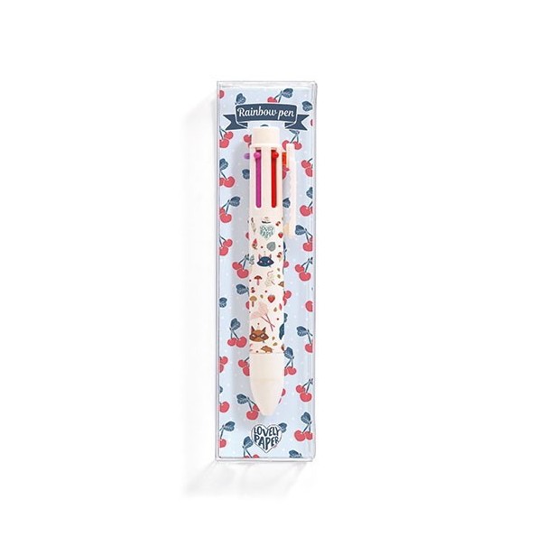De la mano de la hermosa línea de papelería Lovely Paper de la casa francesa Djeco, te traemos este hermoso bolígrafo de 6 colores Lucille, de color blanco con una decoración de lo más adorable, con animalitos y objetos. El bolígrafo diseñado por Lucille Michieli contiene los siguientes colores: naranja, rojo, rosa, lila, azul y verde.