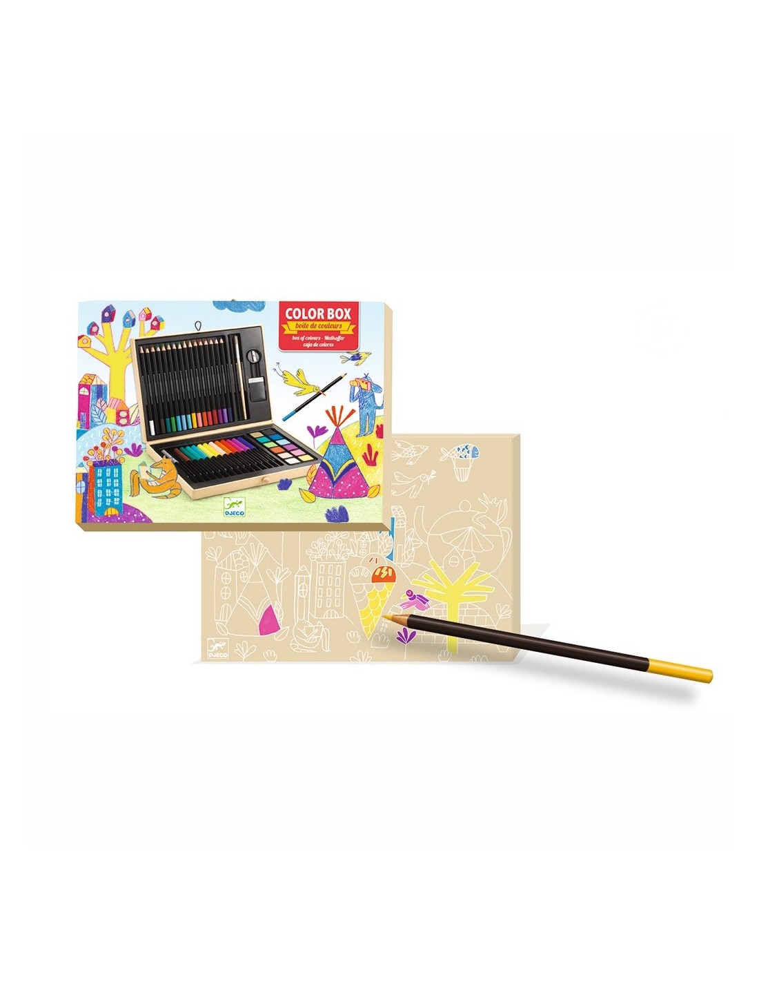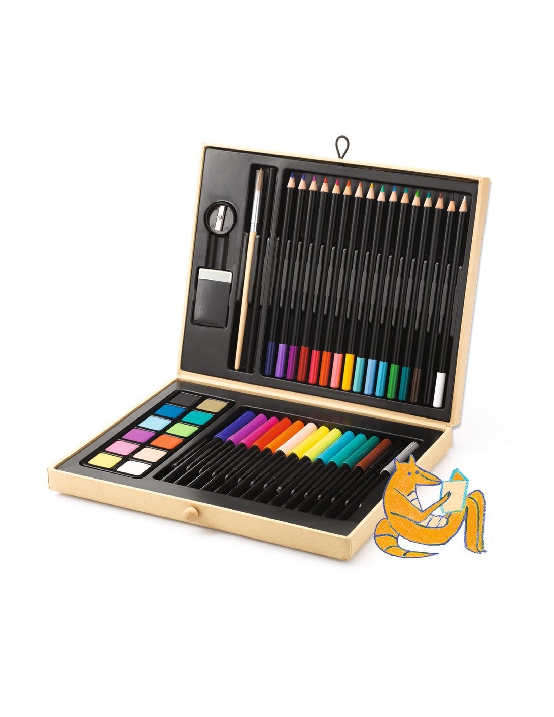 Las buenas herramientas hacen que las actividades sean más fáciles y den mejores resultados. La marca de juguetes Djeco sigue desde siempre esta filosofía y por eso ha creado esta caja con los mejores componentes en cuanto a colores, rotuladores y pinturas. La caja es un bonito maletín de cartón duro con una ilustración a la espera de ser coloreada por su dueño o dueña. Cuando esté pintada será un maletín único en el mundo y el aliado perfecto para las mentes creativas. Contenido: 1 estuche para personalizar, 16 lápices de colores, 14 rotuladores de punta fina, 12 tabletas de pintura, 1 pincel, 1 lápiz, 1 sacapuntas y 1 goma de borrar