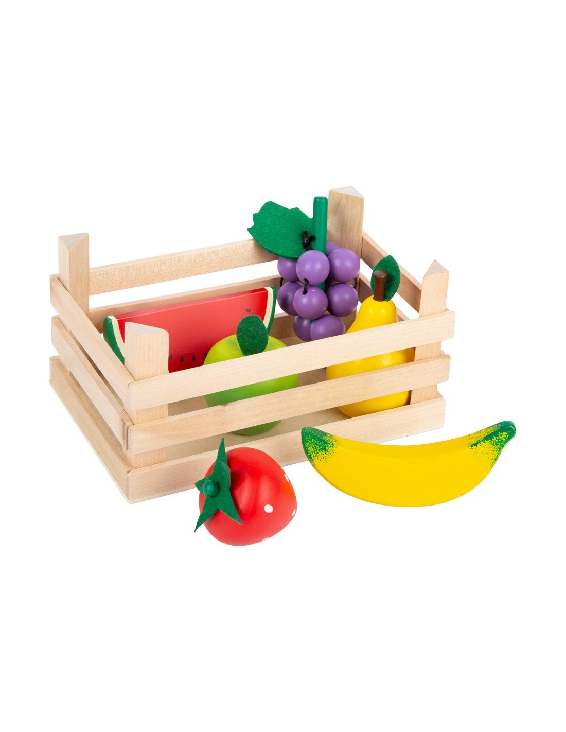 ¡Hoy hay fruta! Esta caja de madera con frutas es perfecta para jugar al mercado o la cocina y consiste en pera, uva, fresa, sandía, manzana y plátano. ¡Qué rico!
