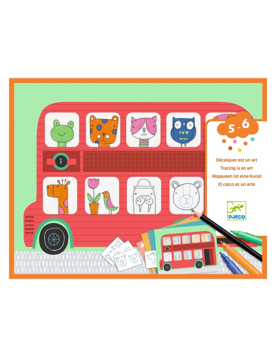 Los motivos son principalmente animales ilustrados de tal manera que son fáciles de calcar para los peques. Incluye 4 marcadores para colorear. El papel y el cartón utilizados para la producción de este juguete cuentan con el certificado ecológico FSC®.