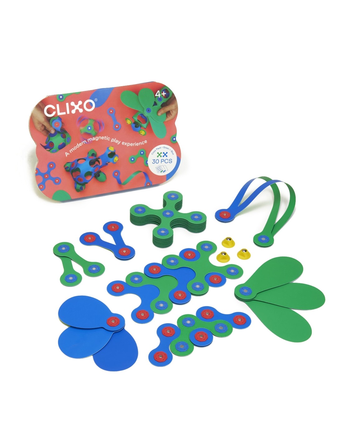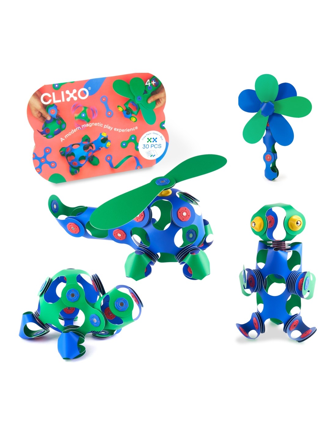 El set incluye 30 piezas magnéticas en azul y verde, con formas variadas que se adaptan a la imaginación de los niños. Las dimensiones del paquete son 23 x 16,5 x 6,5 cm, y es recomendado para niños a partir de 4 años. Con el Clixo Crew Pack, cada construcción se transforma en una experiencia educativa y lúdica que potencia la imaginación y la diversión sin límites.