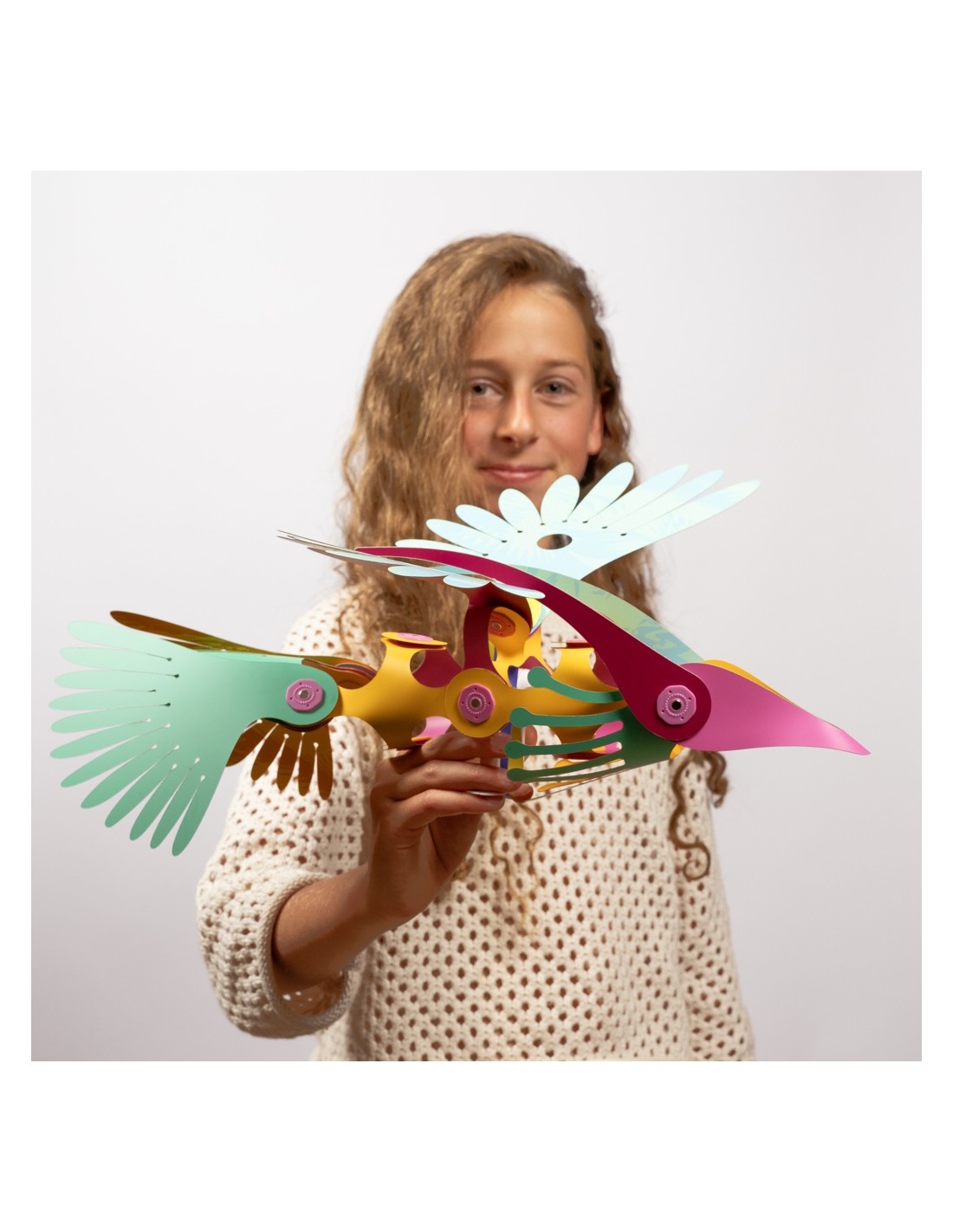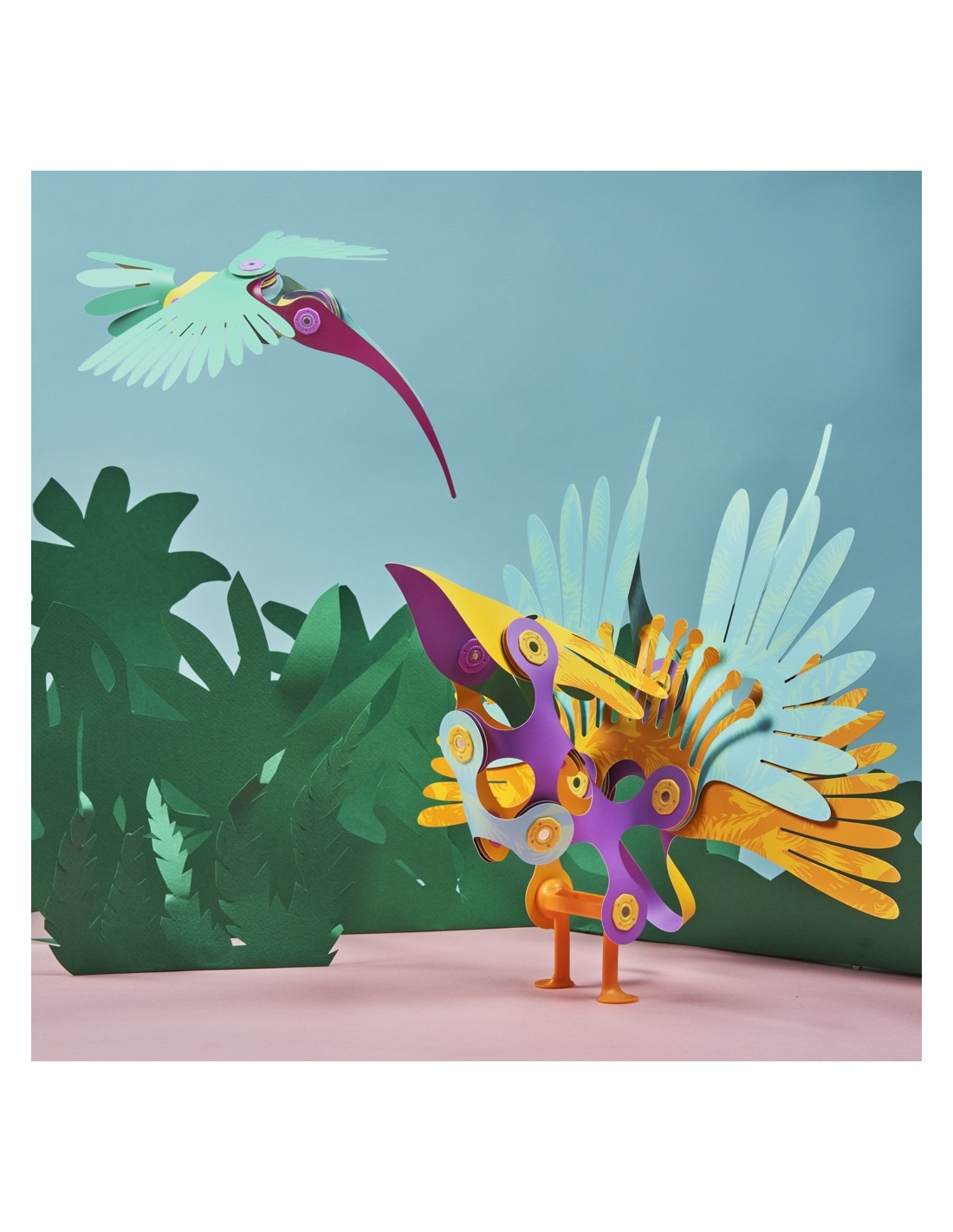 El set incluye 22 piezas en total, 7 aves tropicales con mecanismo de aleteo y piezas inspiradas en la naturaleza que permiten construir una variedad infinita de figuras. El diseño ecológico del embalaje hace que sea respetuoso con el medio ambiente y reutilizable, ideal para familias que buscan juguetes sostenibles.