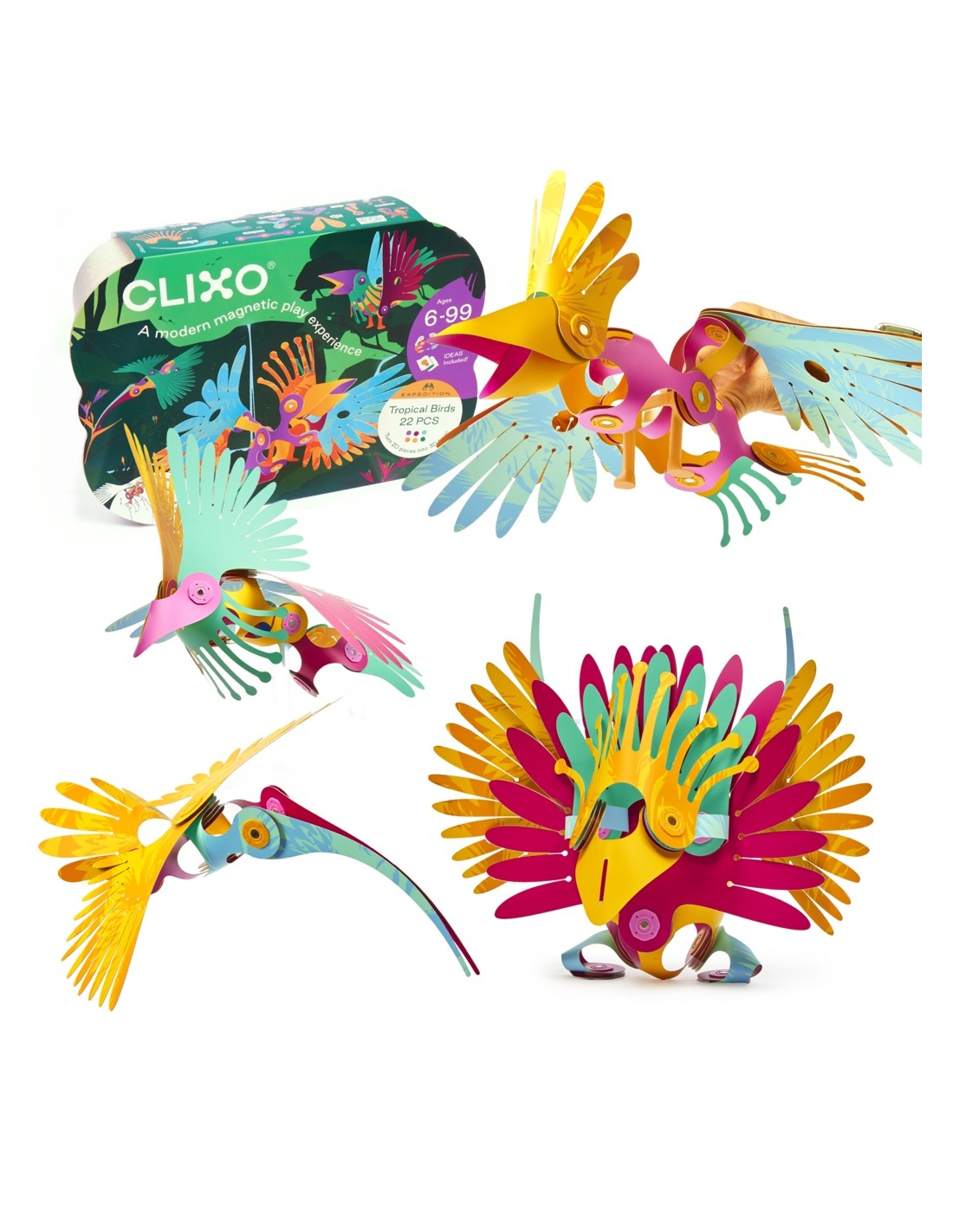 Descubre el Clixo Tropical Birds Pack, un set creativo que invita a los niños a explorar el mundo de la selva a través del juego. Con sus 22 piezas flexibles y magnéticas distribuidas en 11 formas diferentes, incluidos 7 diseños exclusivos de aves tropicales, este pack permite construir desde majestuosos tucanes hasta elegantes colibríes, fomentando la imaginación y la creatividad sin límites.