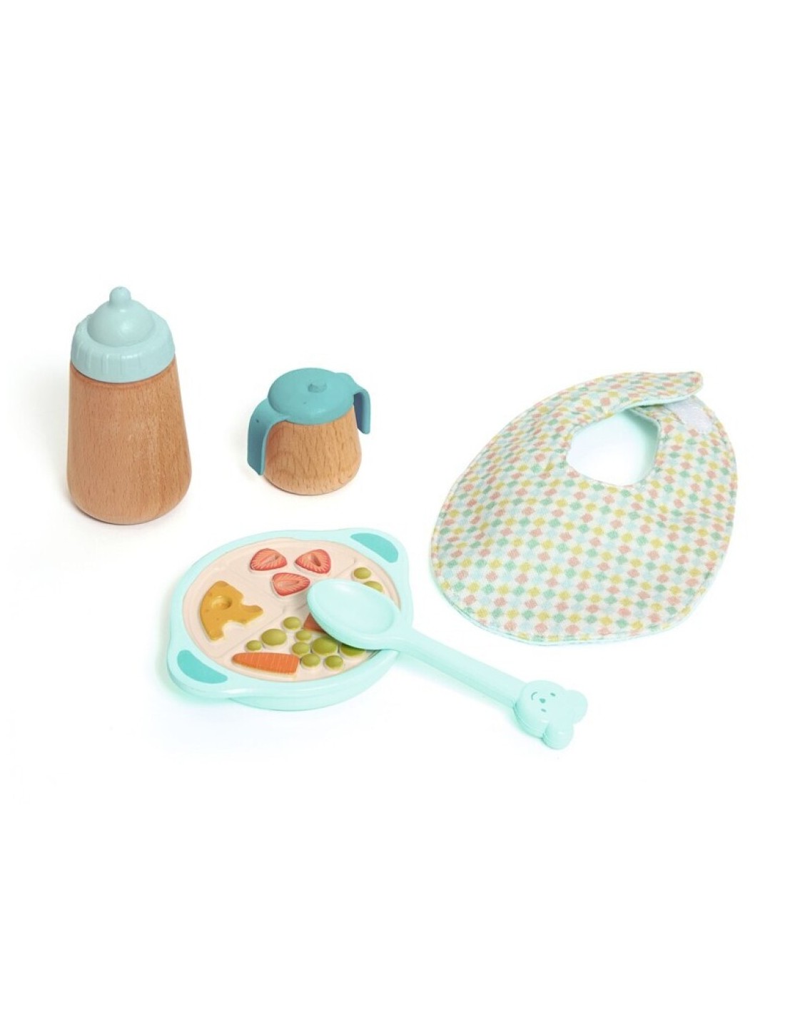El conjunto incluye todo lo necesario para organizar una comida completa para las muñecas: vajilla, cubiertos y biberón, además de otros accesorios inspirados en los objetos reales que usan los bebés. Cada elemento está elaborado con materiales seguros, resistentes y agradables al tacto, pensados para soportar el juego diario sin perder su encanto. Los tonos suaves y el diseño delicado, característicos de la línea Poméa, hacen de este set una propuesta estética y funcional al mismo tiempo.