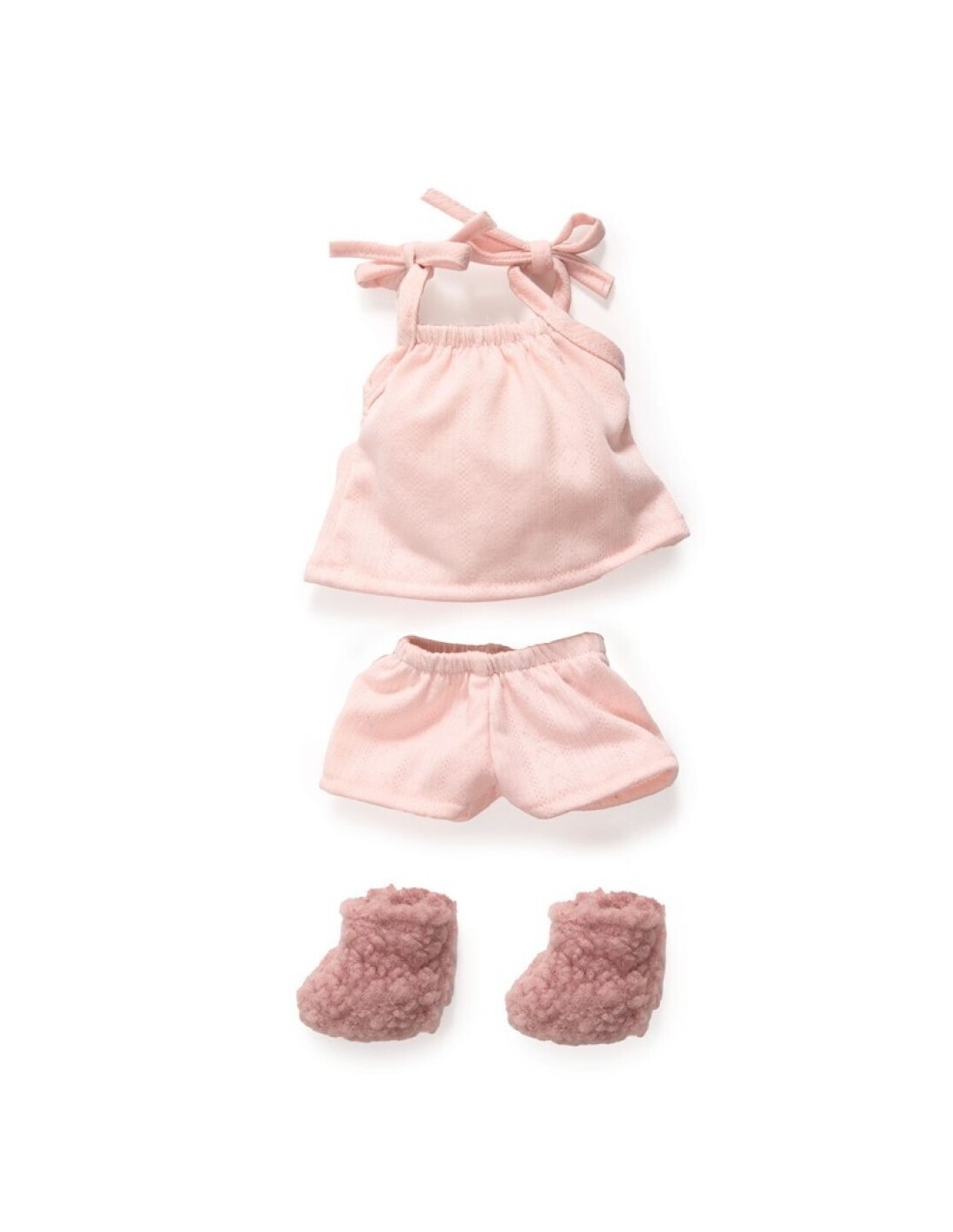 El Conjunto de ropa para muñecas Lune Poméa de Djeco es una propuesta encantadora que invita al descanso y al juego. Este conjunto, perteneciente a la colección Poméa, ha sido diseñado con mimo para que las muñecas luzcan adorables incluso a la hora de dormir. Consta de una camiseta de pijama y un pantalón corto confeccionados en suave tejido de punto, además de unas zapatillas rosas blanditas que completan un look cómodo y tierno.