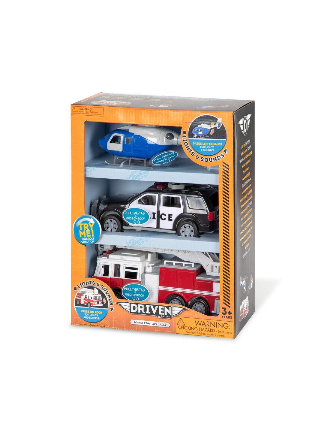 ¡Oh no, parece una emergencia! Afortunadamente, puedes ayudar con la Micro Flota de Rescate de Driven by Battat. ¡Este set de vehículos de juguete tiene todo lo que necesitas para una gran misión de rescate! Hay un camión de bomberos con una escalera extensible y patas de apoyo plegables para mantenerlo resistente. La camioneta de la policía tiene una flecha intermitente que se mueve hacia arriba y hacia abajo para que puedas dirigir el tráfico. En cuanto al helicóptero, tiene una hélice que realmente gira, ¡solo presiona y mira cómo vuela! ¡Al rescate!