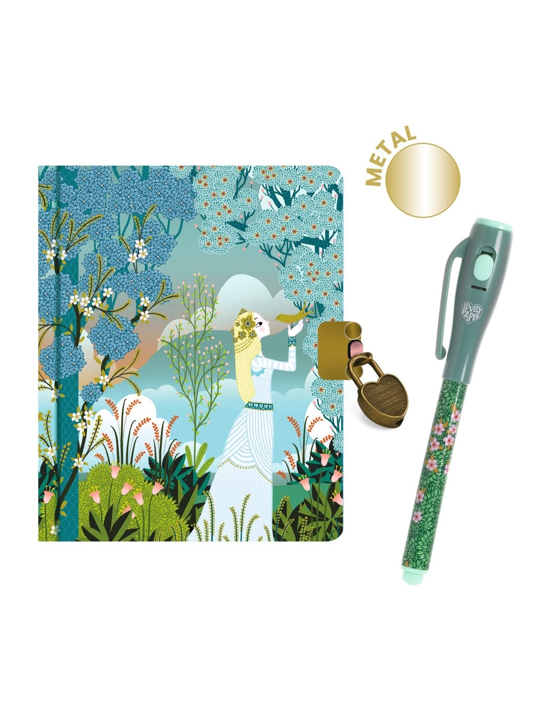 El acabado brillante con detalles metálicos y la portada impresa con un precioso diseño en tonos azules, protagonizado por una encantadora chica y pájaros, añaden un toque de elegancia y delicadeza. El efecto mágico se desata con el bolígrafo de tinta invisible, cuyos secretos se revelan con la luz ultravioleta, suministrando una experiencia única y emocionante.