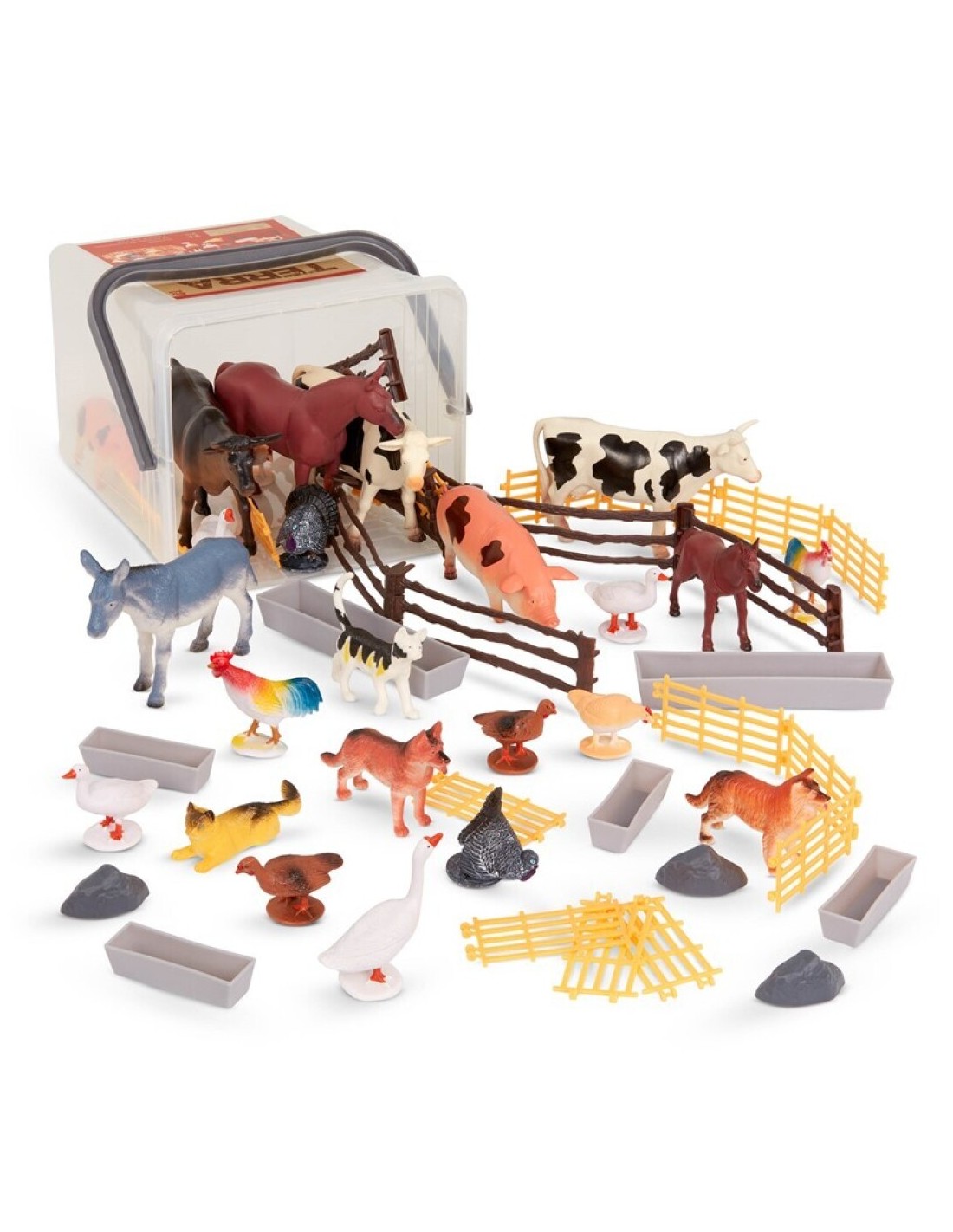 El Cubo marrón claro Animales de granja con 60 piezas de Terra es un juguete pensado para acercar a los niños al mundo rural a través del juego creativo y el descubrimiento. Este cubo reúne una colección de figuras de granja en miniatura y accesorios que permiten montar un establo completo, inventar historias cotidianas y recrear escenas rurales llenas de vida. Con 60 piezas en total, el juguete ofrece variedad suficiente para que cada partida sea distinta y para que los pequeños jugadores desarrollen narrativas propias mientras exploran la relación entre animales, niños y el entorno de la granja.