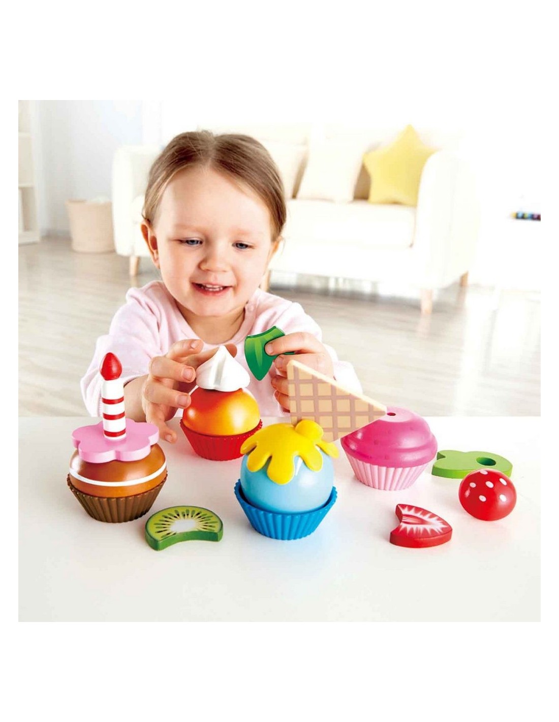 Es hora de un dulce desayuno... ¡O una dulce merienda! Con este set de cupcakes de madera podrás montar vistosas magdalenas con las distintas combinaciones posibles e, incluso, soplar una y otra vez la vela de cumpleaños que se incluye. ¡Qué delicia!