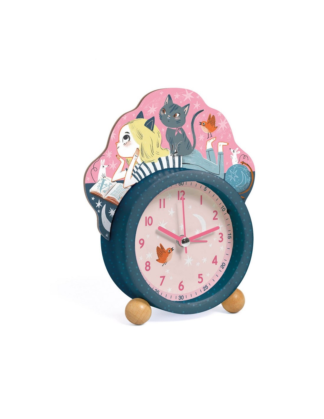 ¡Buenos días, hora de despertarse! Este fantástico reloj despertador de la prestigiosa marca francesa Djeco ha sido diseñado por Lucille Michieli y muestra una tierna imagen de una preciosa niña con su gatito, ratoncito y pajarito mientras escribe en su diario.