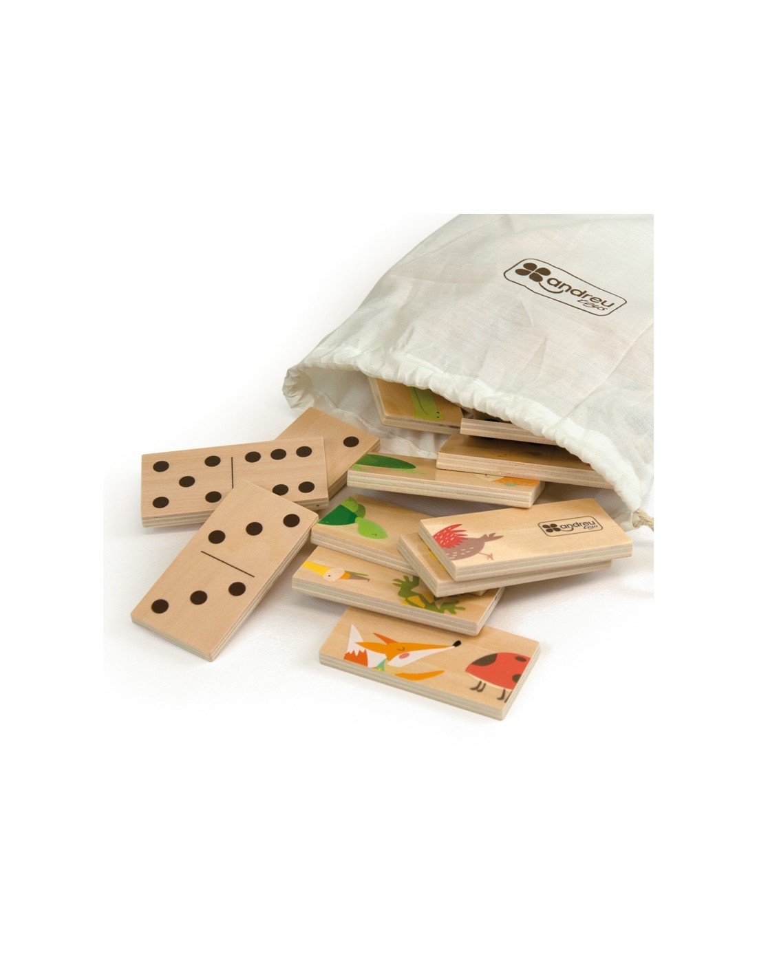 Te presentamos Dominó Puzzle Animales, un dominó de 28 piezas de la marca Andreu Toys. ¡Empareja las mitades de los animales, en horizontal y vertical, para formar un bonito puzzle! Podréis también jugar al clásico dominó de puntos dando la vuelta a las piezas de madera: ¡apto para que disfrute toda la familia! Incluye un saco de tela, perfecto para su almacenamiento y transporte. Las medidas de las piezas son de 8 x 4 x 0,7 centímetros, perfecto para las manos más pequeñas.