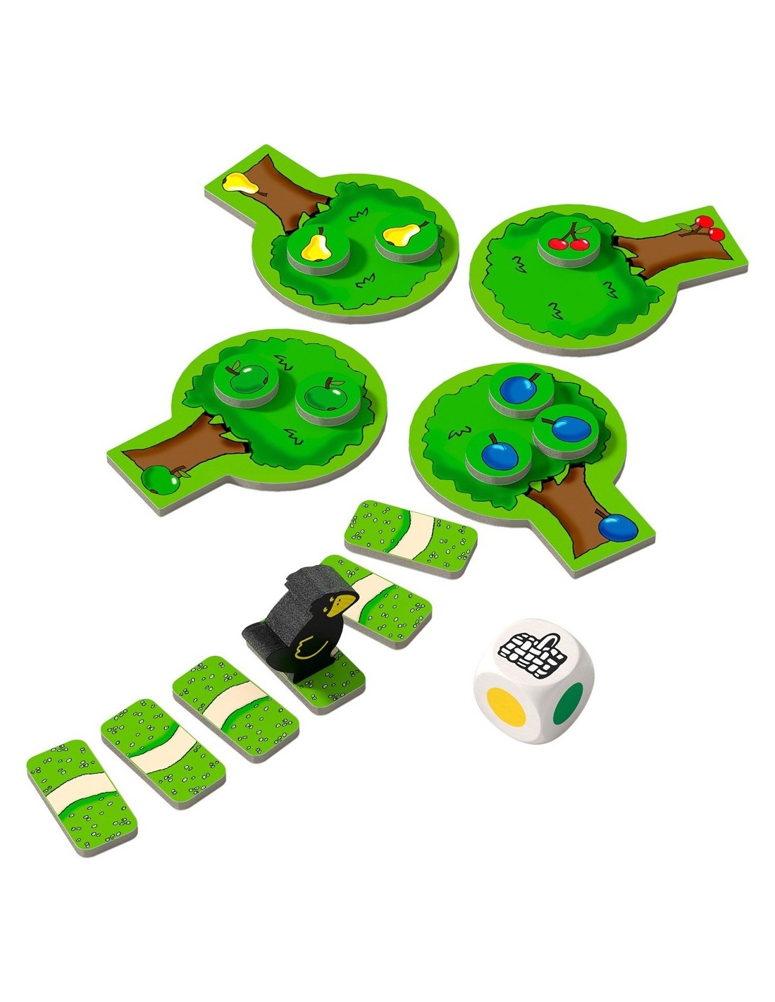En los árboles cuelgan las cerezas, las manzanas, las ciruelas y las peras más jugosas. Pero hay alguien que quiere robarlas antes: ¡Teo, el cuervo, se está aproximando! Los jugadores y jugadoras necesitan ahora algo de suerte con los dados. Juntos intentarán coger las frutas antes de que el descarado cuervo llegue a los árboles frutales.