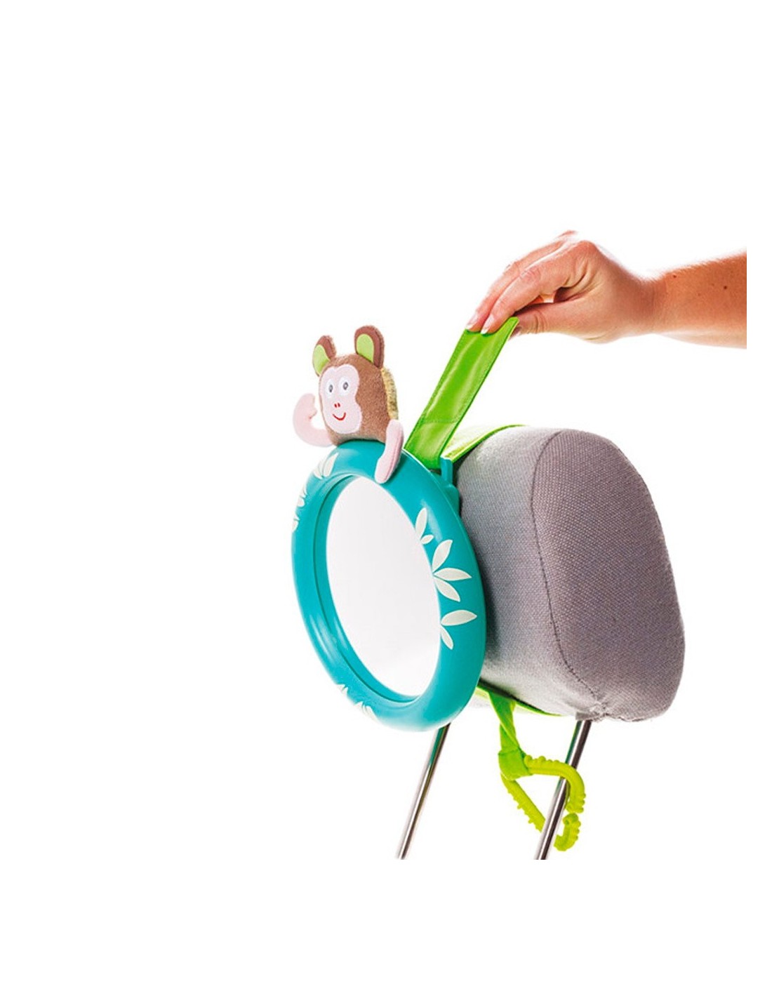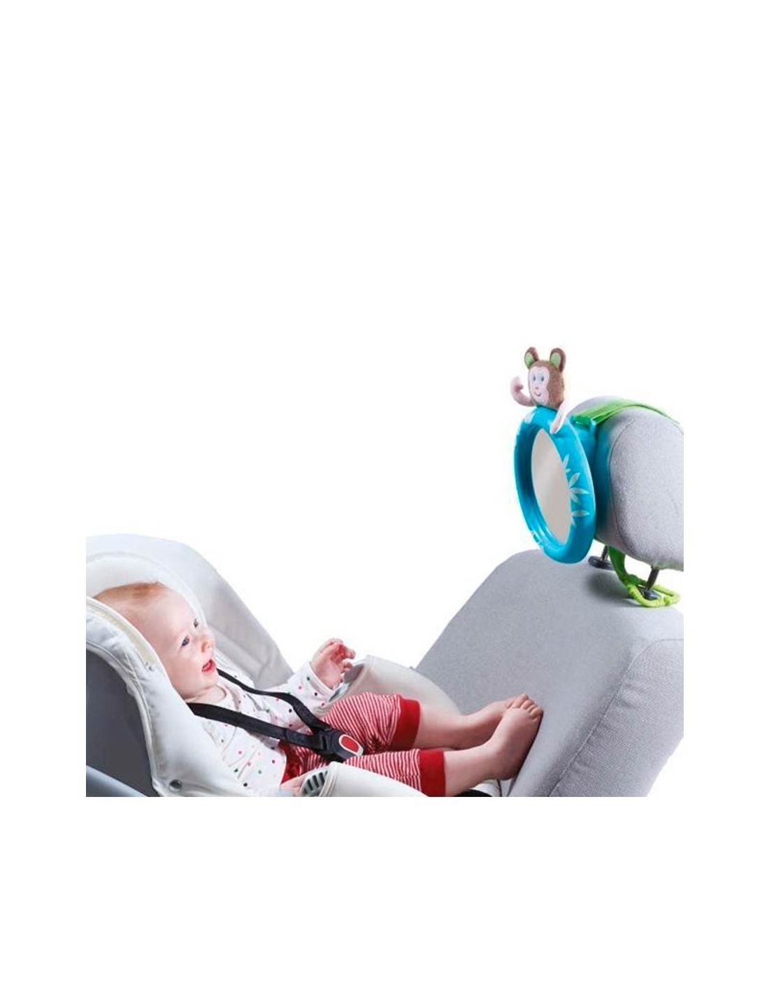 Con este bonito espejo podrás vigilar a tu peque mientras conduces. El espejo se coloca en el reposacabezas del asiento posterior y, en combinación con el retrovisor de tu coche, hace que puedas ver su carita si necesidad de girar la cabeza. Además, el espejo trae un divertido monito en la parte superior del espejo que le mantendrá entretenido durante el viaje. El espejo es irrompible y tiene una curvatura especial que aumenta su visibilidad. La anilla y la correa están reforzadas para mayor seguridad y es muy fácil de fijar mediante el velcro incluído en la correa.