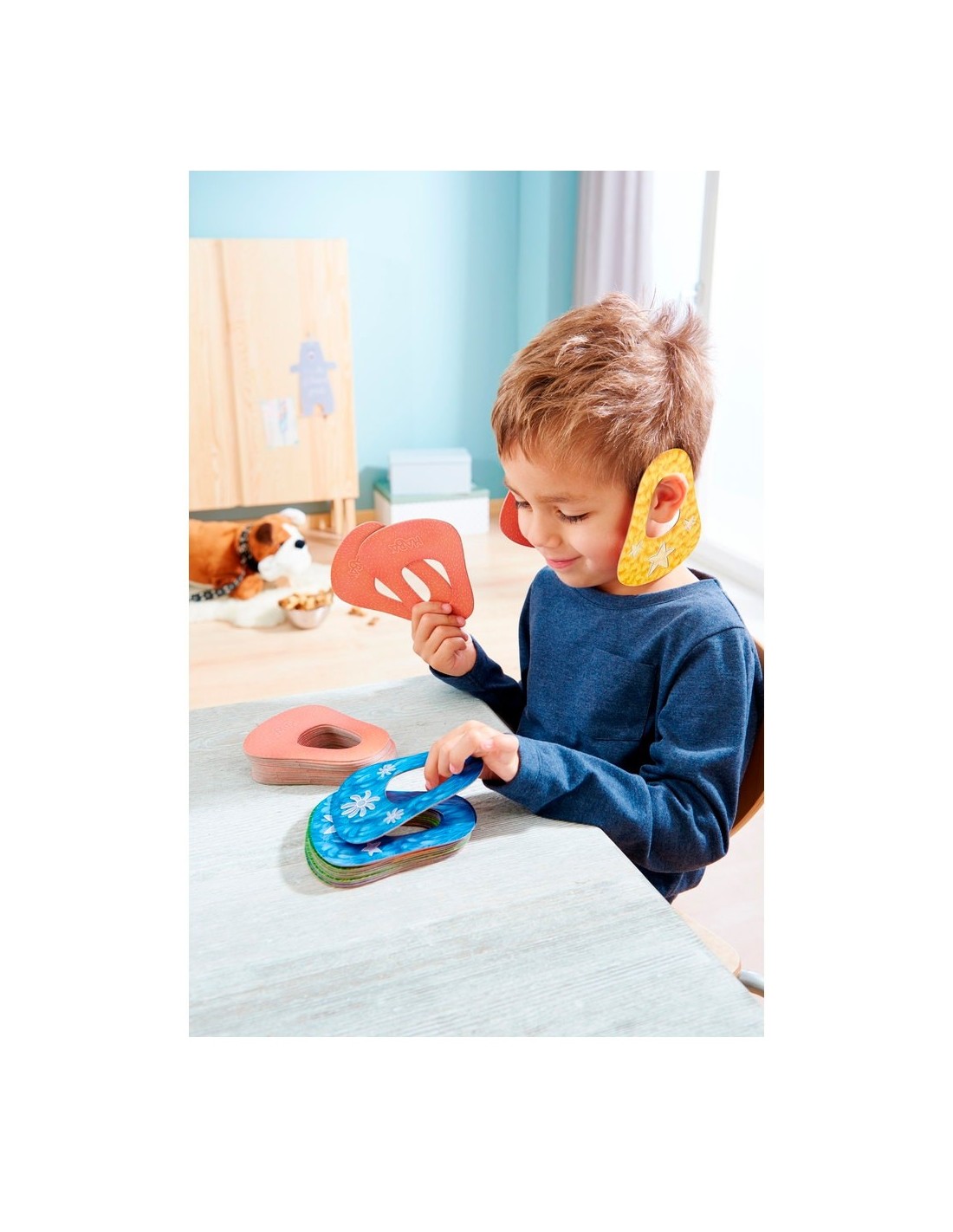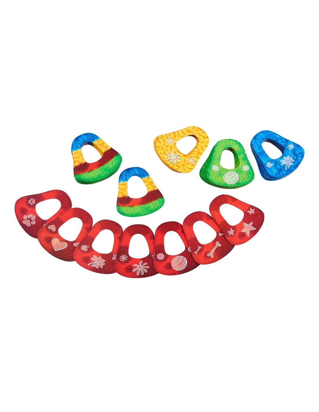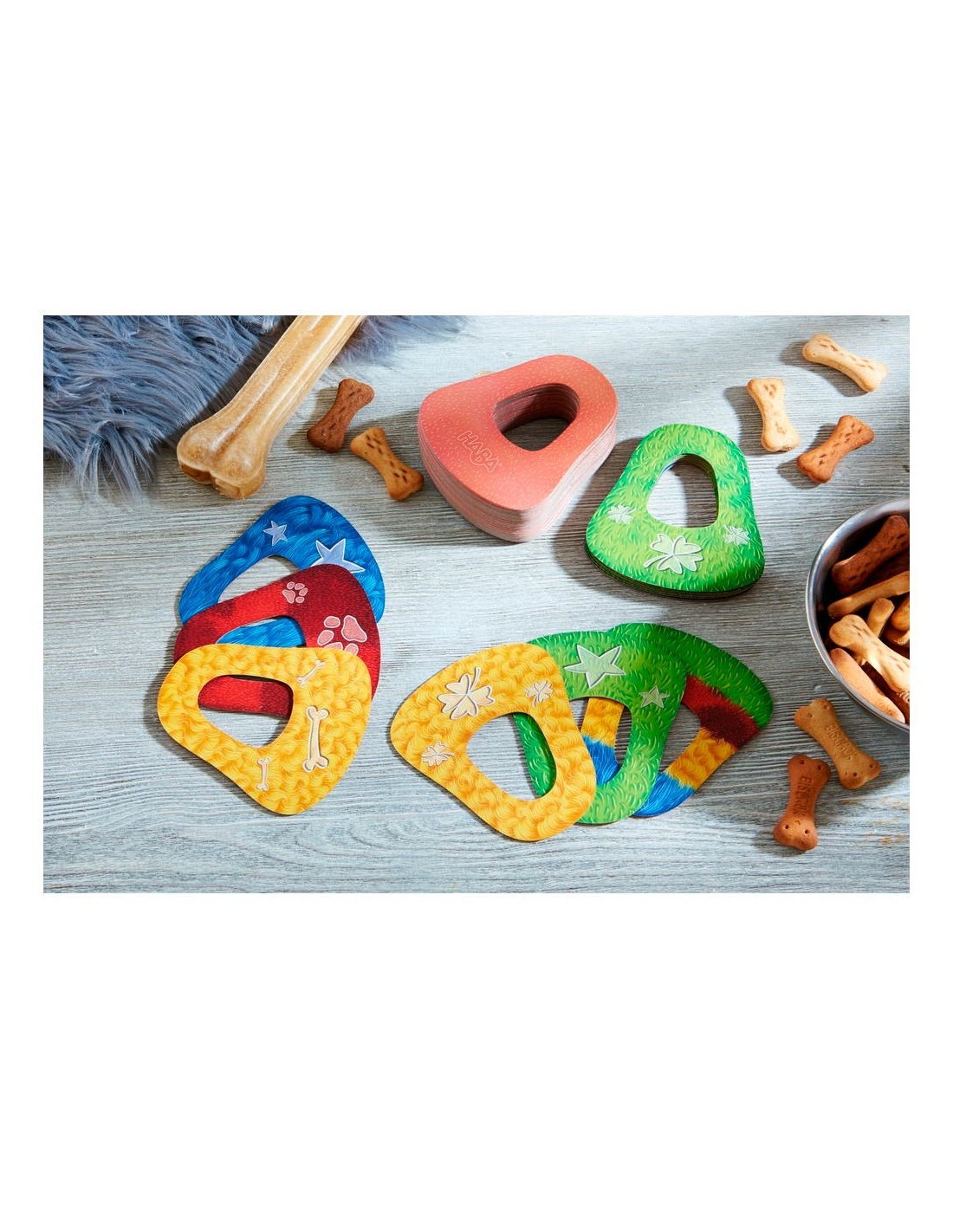 ¡Guau, guau! ¡Comienza la función! En este descarado juego con coloridas orejas de perro, cada cual intenta ser el primero en deshacerse de sus orejas. Pero ¡ojo!, porque aquí predomina la regla: ¡La oreja tiene preferencia! Así que no olvidéis jugar en primer lugar las orejas que tenéis colgadas en vuestras propias orejas. ¿Habéis memorizado bien qué orejas colgantes tenéis? Porque de lo contrario, acumularéis cada vez más y más orejas. ¿Quién tiene buena memoria y llega al podio como campeón de las orejas colgantes del mundo? Contenido: 36 orejas de perro sólidas, 1 instrucciones del juego.