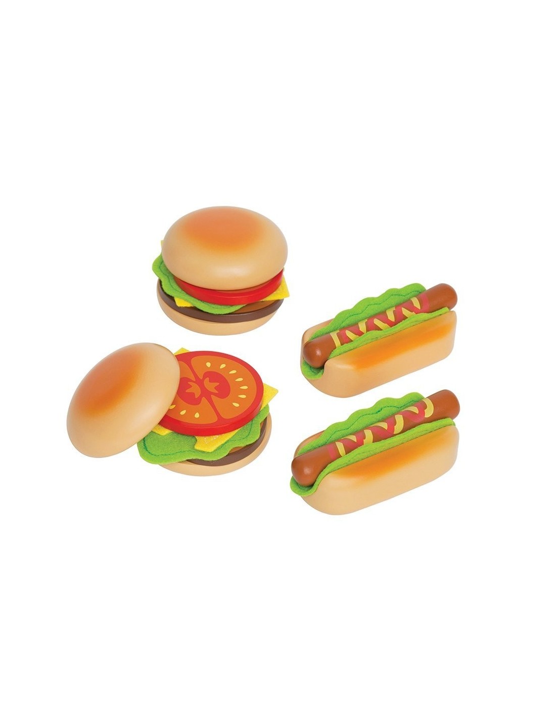 Un conjunto de comida rápida para jugar a juego imitativo y de rol. Con él podrás hacer deliciosas hamburguesas y hotdogs que podrás servir a tus invitados. Pero antes tendrás que cocinar y montar los platos: primero el pan, luego la lechuga, luego el queso... El material con el que está hecho es tejido y madera. Un pack súper divertido con el que podrás hacer 2 hamburguesas y 2 hotdogs de juguete. ¿Te atreves? ¡Buen provecho!
