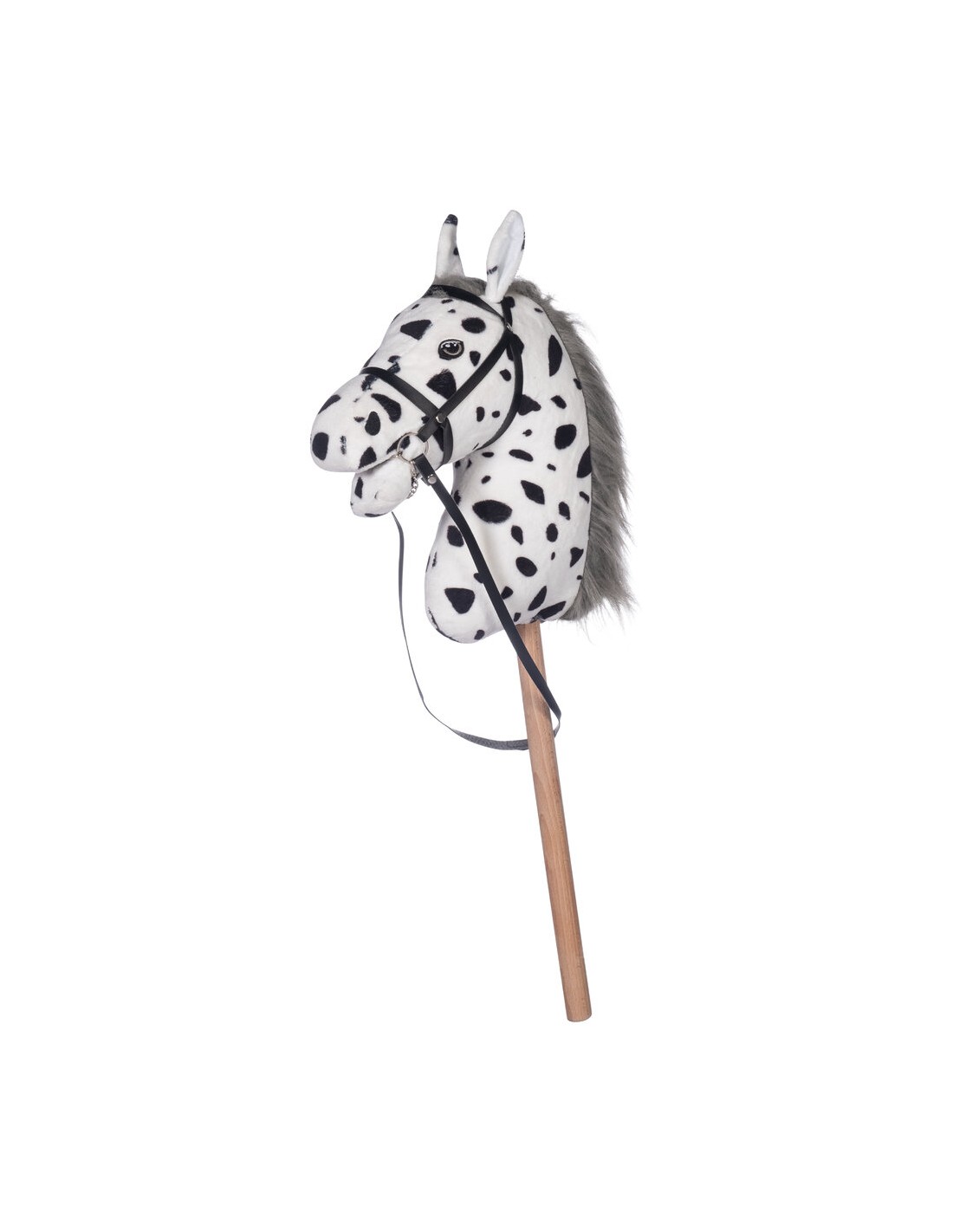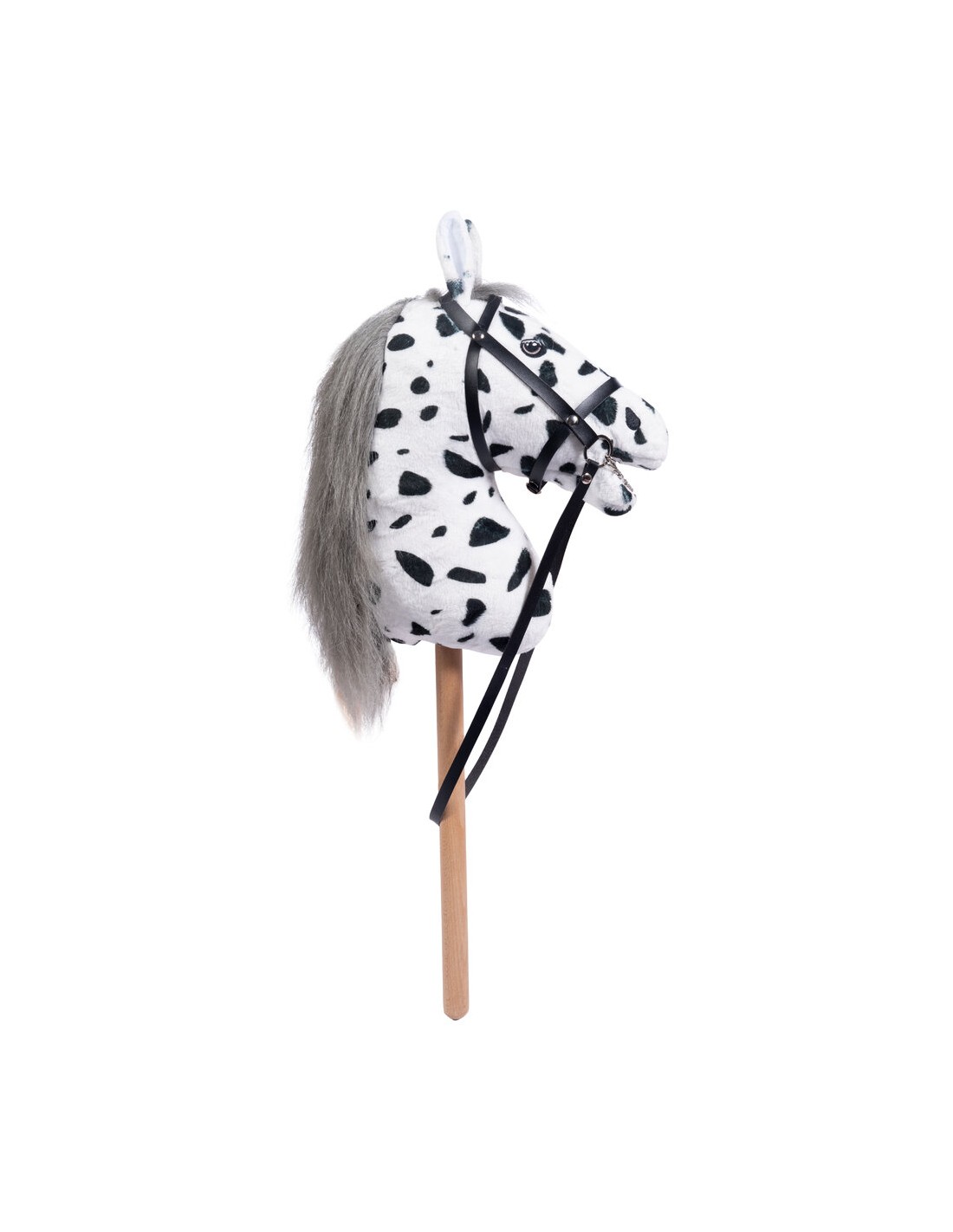 Su cabeza de poliéster combina con elegancia el blanco y el negro, logrando un aspecto realista y expresivo que enamora a primera vista. Viene equipado con una brida de poliuretano cosida bajo las orejas, que puede retirarse fácilmente con unas tijeras si se desea cambiar o personalizar el look del caballo. Su estructura ligera y equilibrada, con un palo de madera de 40 cm y un peso aproximado de 650 g, lo convierte en un compañero perfecto para juegos tanto en interiores como en exteriores.
