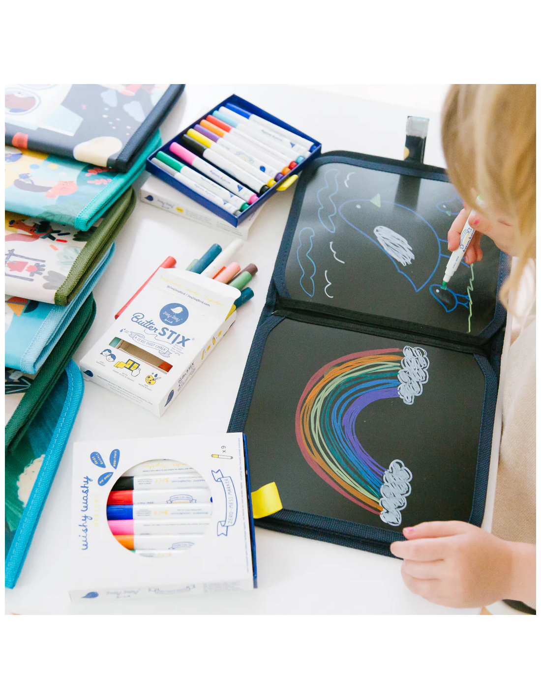 El libro incluye ocho páginas con efecto pizarra, especialmente pensadas para dibujar, colorear y escribir sin miedo a equivocarse. Su superficie negra realza los colores de las ButterStix®, tizas de textura suave que dejan un trazo rico y fluido, casi como pintar con mantequilla. Totalmente libres de polvo y no tóxicas, permiten un juego limpio y seguro incluso en espacios pequeños. Cuando llega el momento de empezar de nuevo, basta pasar un paño húmedo para borrar los dibujos al instante y recuperar el libro como si fuera nuevo.