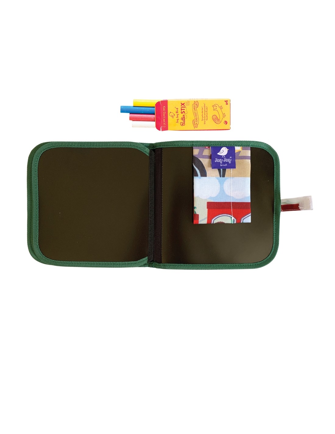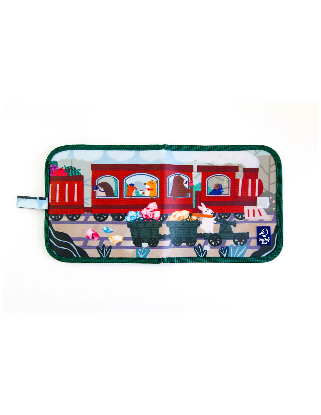 El formato portátil convierte este cuaderno en un compañero perfecto para viajes en coche, vacaciones, restaurantes o cualquier situación en la que se necesite una actividad calmada y creativa. Cerrado mide aproximadamente 20 x 20 cm, por lo que cabe sin esfuerzo en mochilas y bolsos, y abierto alcanza alrededor de 20 x 40 cm, ofreciendo un espacio generoso donde dibujar locomotoras, túneles o los paisajes que los propios niños imaginen. Además, incluye un bolsillo integrado para guardar las cuatro ButterStix® incluidas, manteniendo todo el material ordenado.