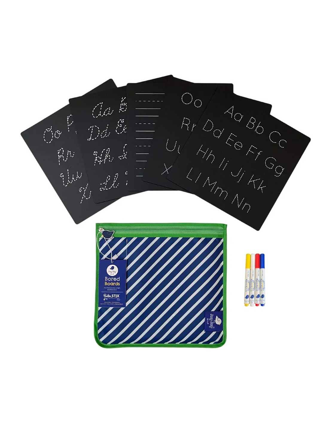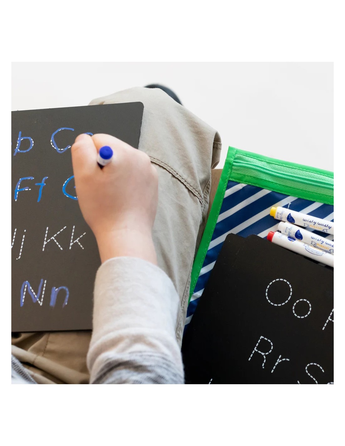 El set incluye 5 pizarras reutilizables y borrables, cada una con un reverso en blanco para dibujar, anotar ideas o practicar fórmulas. Además, contiene 4 mini marcadores Wishy Washy y un estuche de viaje con cremallera y bolsillo para guardar todos los elementos. Solo se necesita un paño húmedo para borrar y reutilizar las pizarras, lo que convierte este juego en una opción sostenible y duradera para el aprendizaje diario.