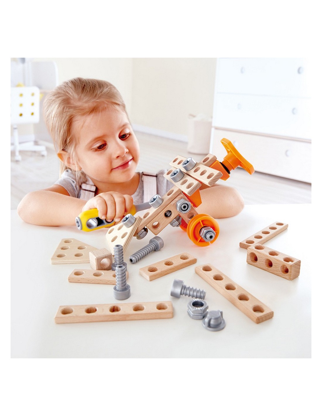 Te presentamos este genial pack de herramientas para principiantes de Hape, en concreto un pack de tornillos y tuercas para los peques de la casa. Con este kit de experimentos los más pequeñines podrán iniciarse en el mundo de la ingeniería y construcción. Contiene 42 piezas de madera con las que podrán crear figuritas de forma ilimitada: motos, aviones, hélices... ¡las posibilidades son ilimitadas!