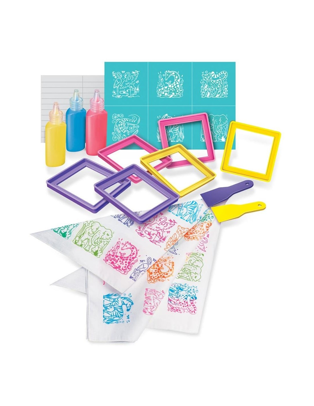 El kit incluye marcos de serigrafía, plantillas reutilizables, pinturas especialmente formuladas para tela y un manual claro y sencillo con pasos detallados. Gracias a este conjunto de materiales, los pequeños artistas pueden crear diseños coloridos y originales sin necesidad de conocimientos previos. Solo tienen que elegir una plantilla, colocarla sobre la tela y aplicar la pintura para ver cómo su idea cobra vida.