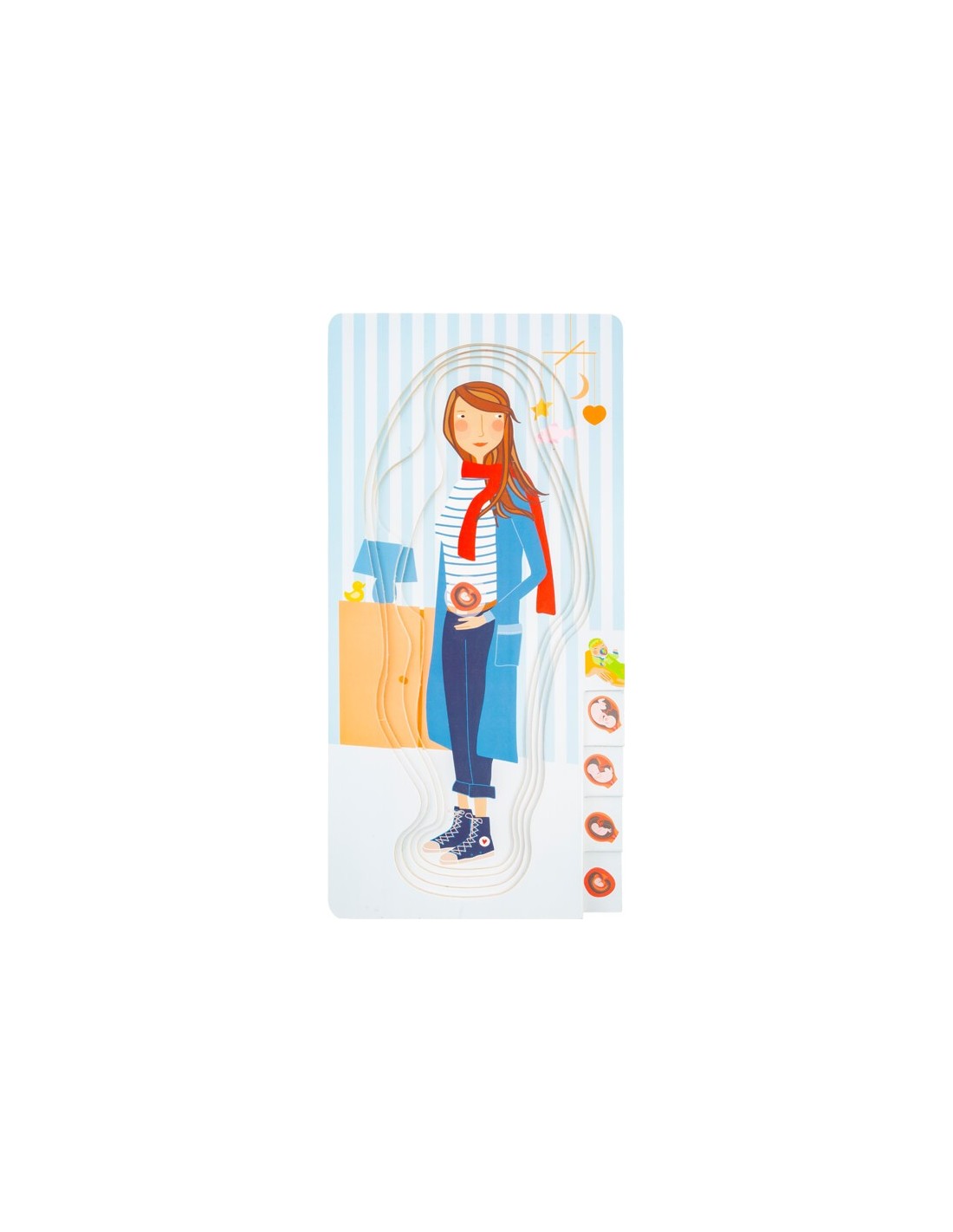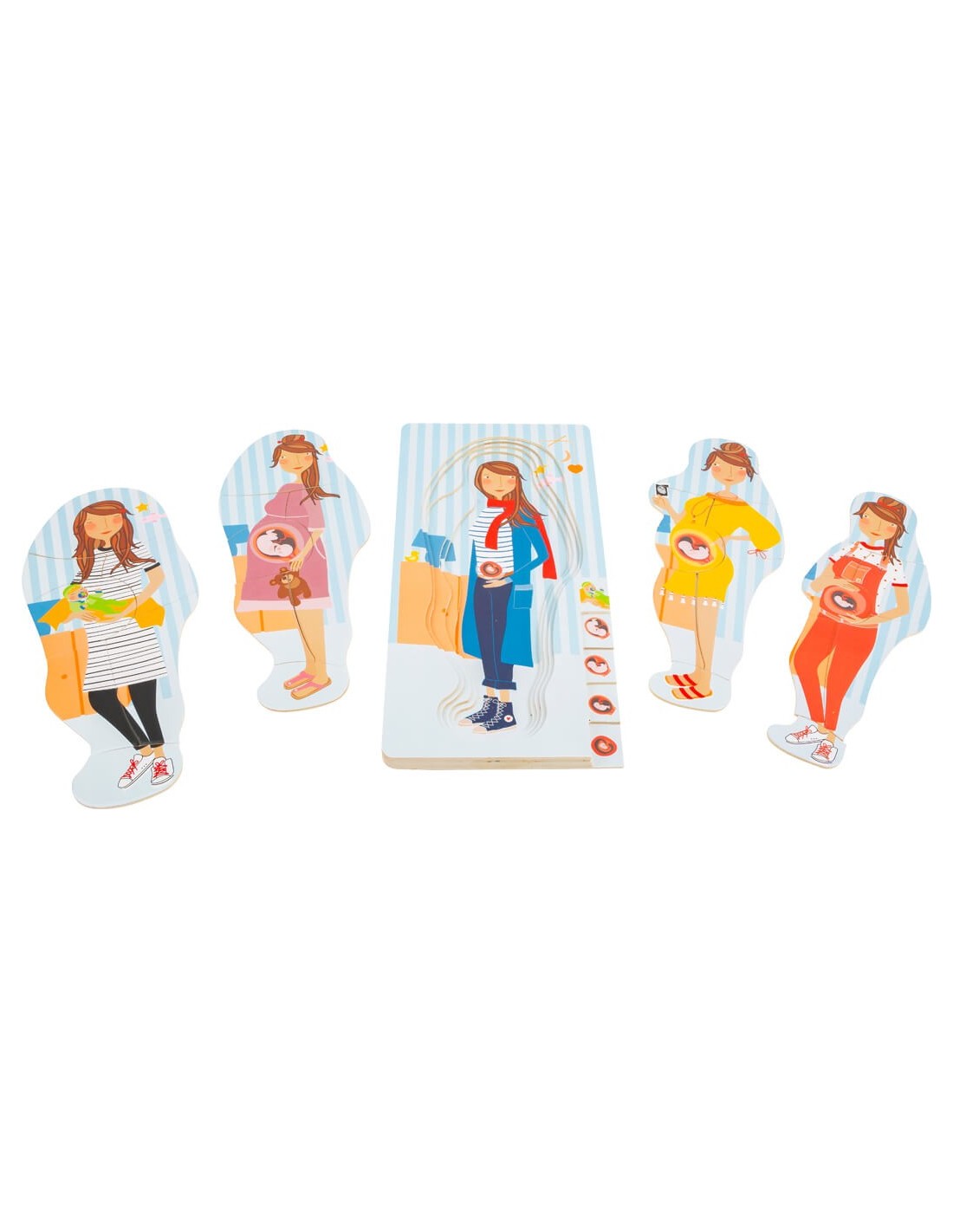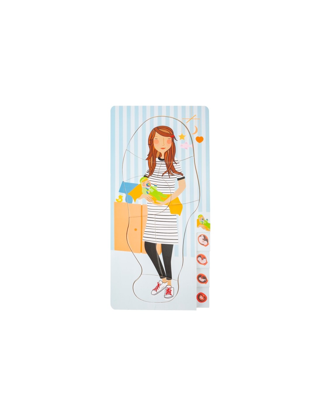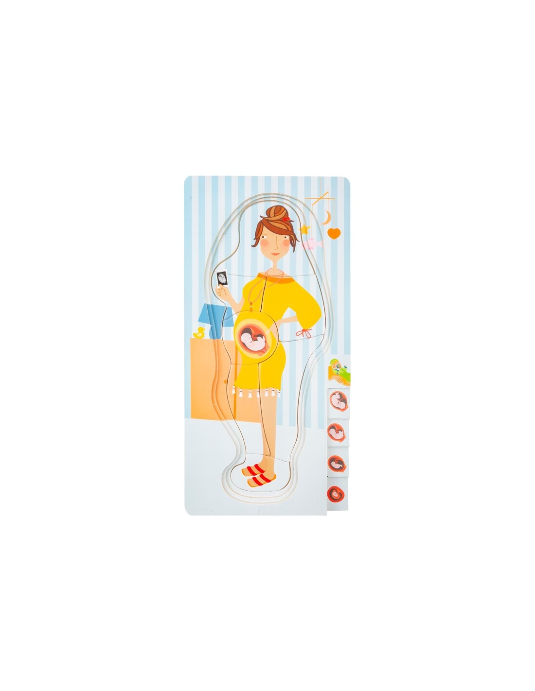 Las diferentes capas del rompecabezas se ilustran con las imágenes del bebé en crecimiento en la barriga en el borde derecho del rompecabezas. ¡Un rompecabezas educativo que es de lo más divertido!