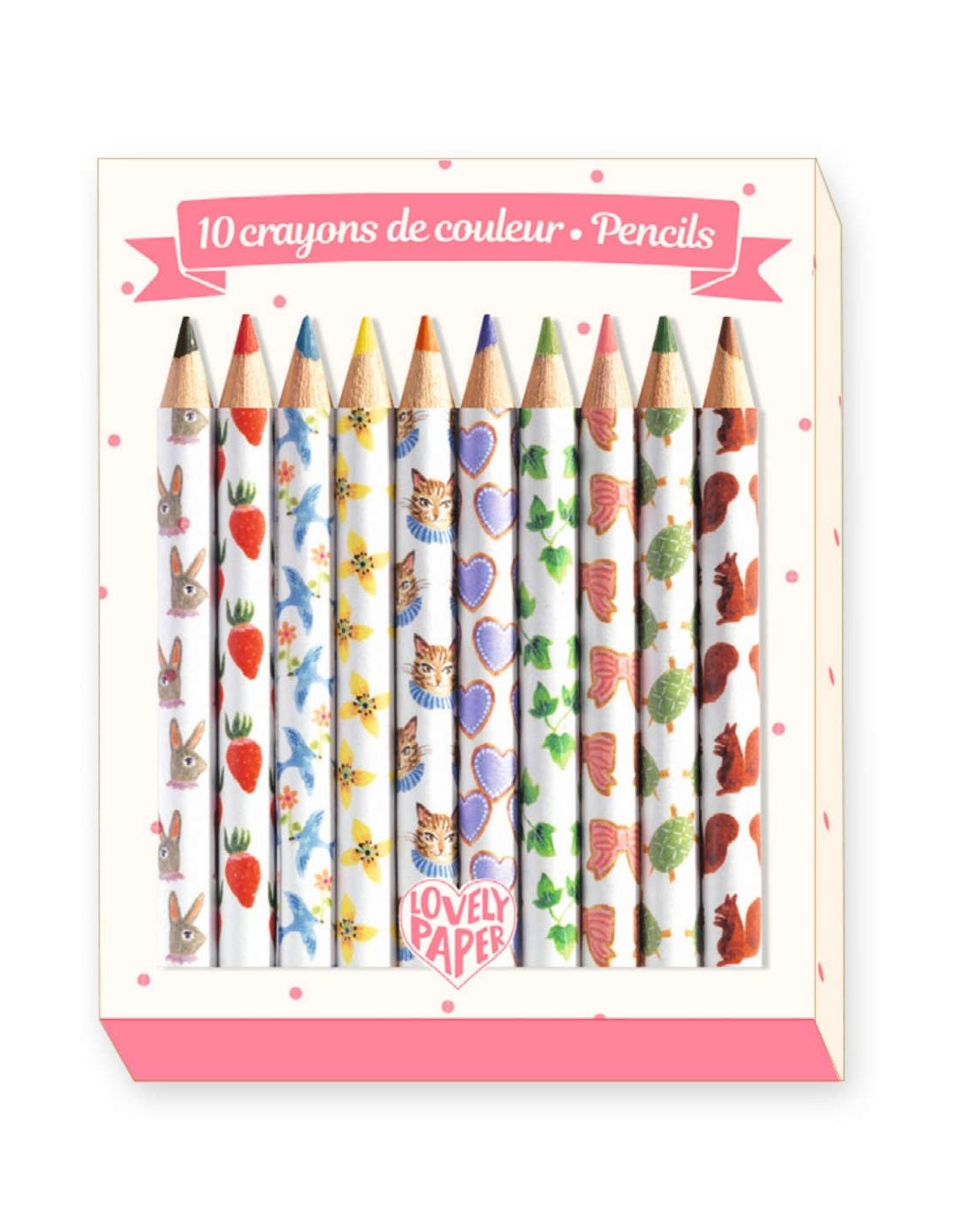 Lovely Paper, la nueva colección de papelería de Djeco, nos presenta este precioso conjunto de 10 Mini Lápices Aiko. Se trata de un pequeño conjunto de lápices de colores perfectos para llevártelos donde quieras. Colorea tus dibujos con este conjunto que cumplirá todos tus deseos. Hay muchos colores diferentes y cada lápiz tiene un estampado diferente de animalitos, frutas, objetos, etc. relacionados con el color en cuestión. Se sirven dentro de una práctica cajita de cartón en la que podrás almacenarlos una vez hayas acabado. ¡Genial!