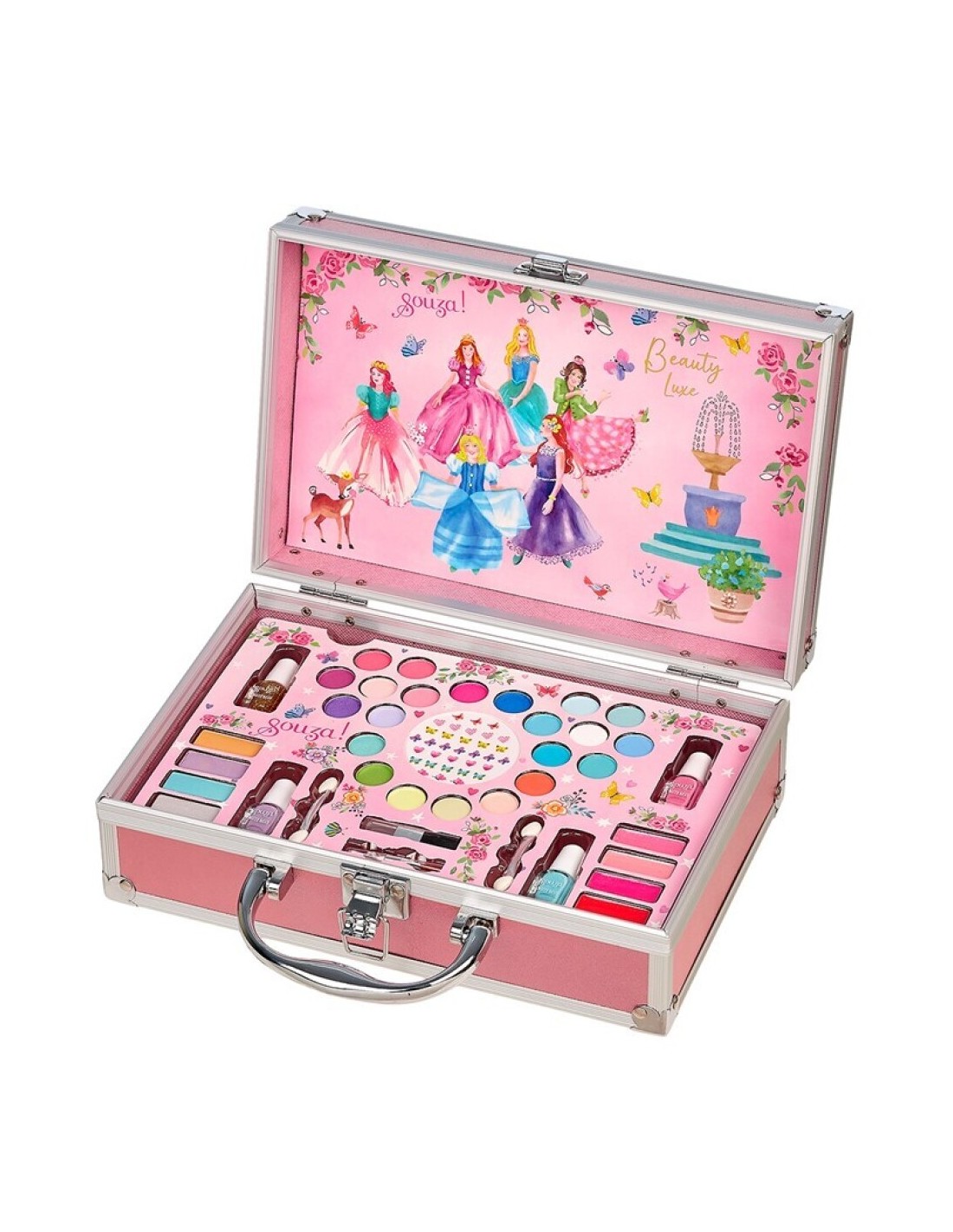 Maletín de Belleza Princesas Souza es un set de juego simbólico pensado para niños y niñas que disfrutan experimentando con estilos, colores y accesorios. Este maletín permite imitar situaciones cotidianas de cuidado personal, explorando la creatividad de forma segura y a través del juego libre.