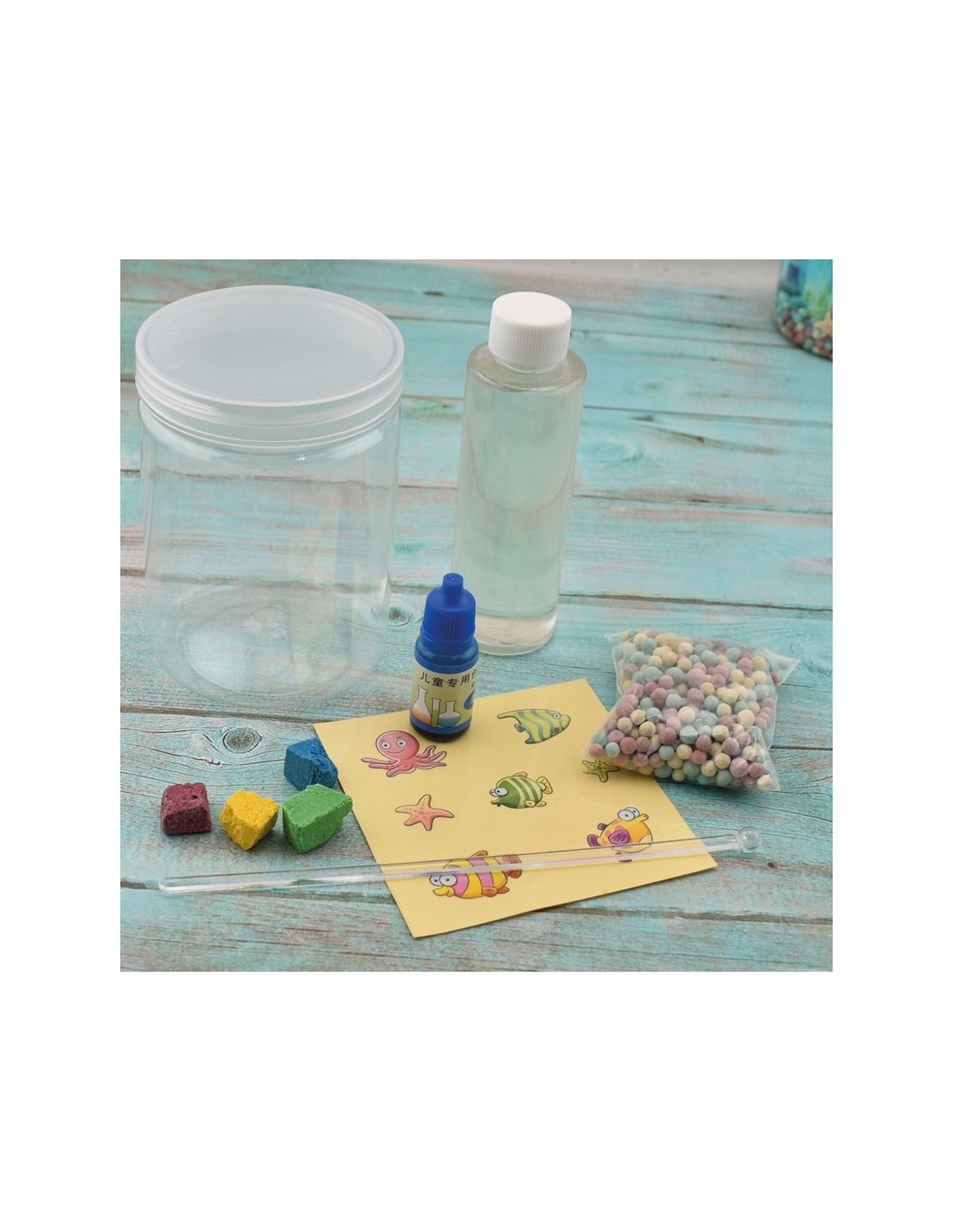 Coloca las bolas de colores y las rocas en crecimiento en la base del frasco transparente. Mezcla la solución de crecimiento con agua caliente en una cierta proporción. Añade unas gotas del pigmento líquido al agua. Aplica pegatinas decorativas y observa el increíble proceso de crecimiento de algunas hermosas plantas acuáticas.