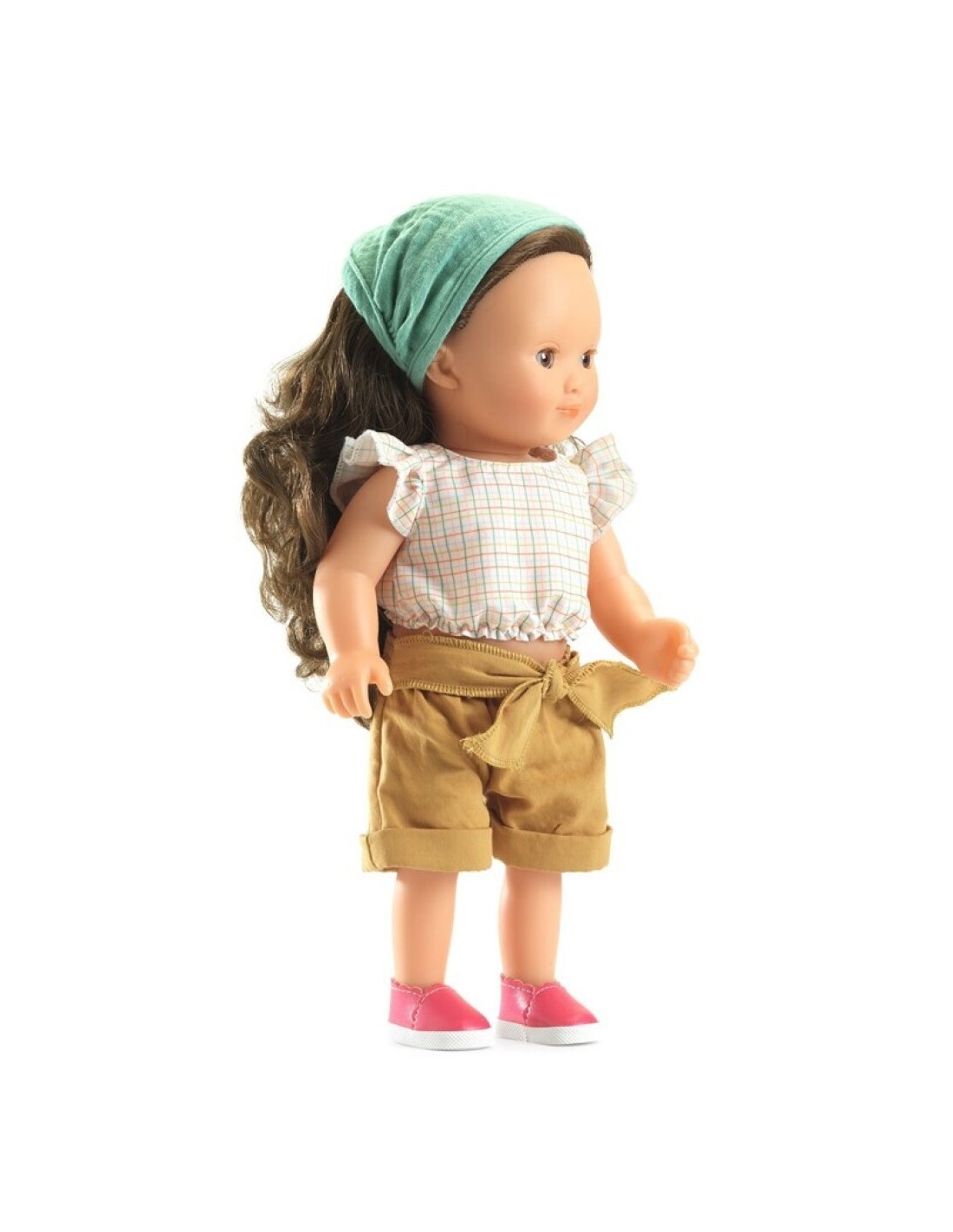 La muñeca incluye un conjunto cuidadosamente diseñado: una camiseta sin mangas con detalles delicados, un pantalón corto con lazo, una braguita, una cinta para el cabello de color verde y unas suaves alpargatas. Todas las prendas son fáciles de poner y quitar gracias a los cierres de velcro y las bandas elásticas, que se adaptan a las manos pequeñas y favorecen el desarrollo de la motricidad fina.