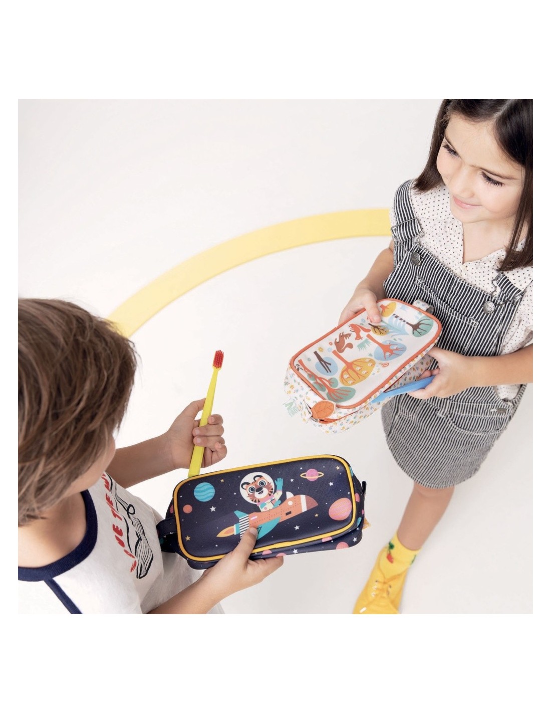 Te presentamos este precioso neceser infantil de Djeco, en el diseño de ardillas, un precioso neceser en colores suaves con un bonito motivo de paisaje de un bosque con ardillas para niños a partir de 3 años. El hermoso diseño es de Tinou Le Joly Sénoville.
