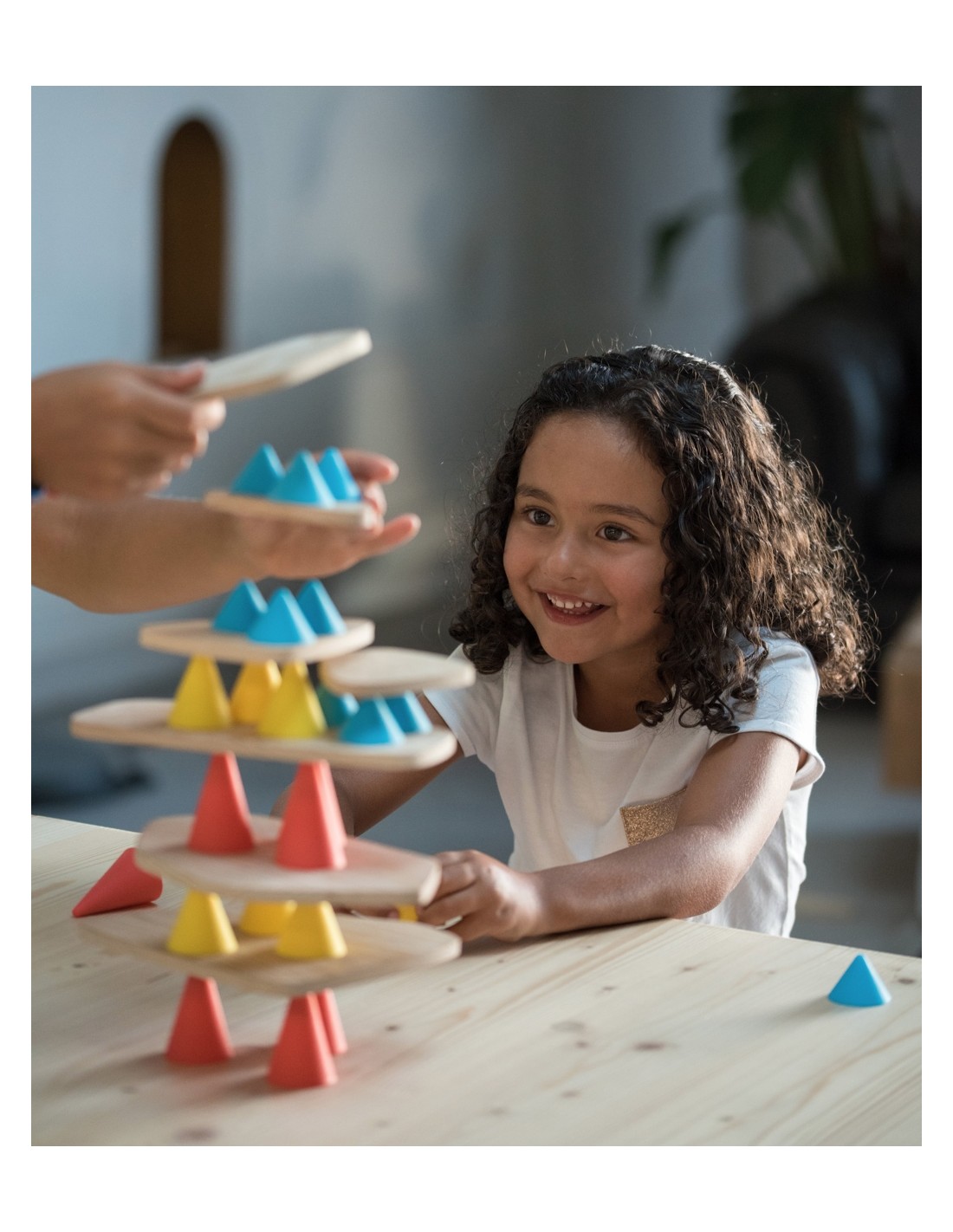 El set incluye 48 conos de silicona en tres tamaños, 16 tablones de haya, una bolsa de algodón para guardar el material y un folleto de instrucciones con ejemplos de tarjetas creativas para inspirar nuevas construcciones. Es un juego versátil que combina diversión y aprendizaje mientras los niños experimentan con el equilibrio y la coordinación.